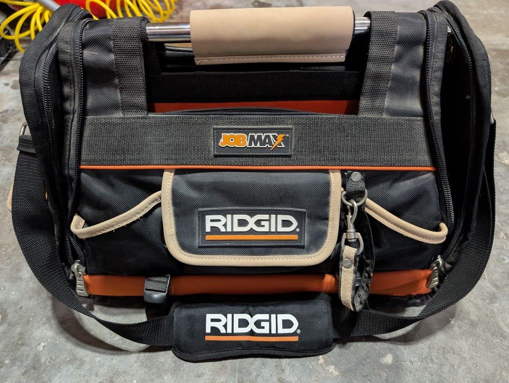 Ridgid JobMax Heavy Duty Tool Bag Top of the line tool bag. Zip down sides on the front and back. Multiple compartments for cordless tools and other small tools. Heavy duty metal handle across the top and shoulder strap. Great for a plumber or handyman. Bag Dimensions: Width = 20 inches Height = 14 inches Depth = 11 inches