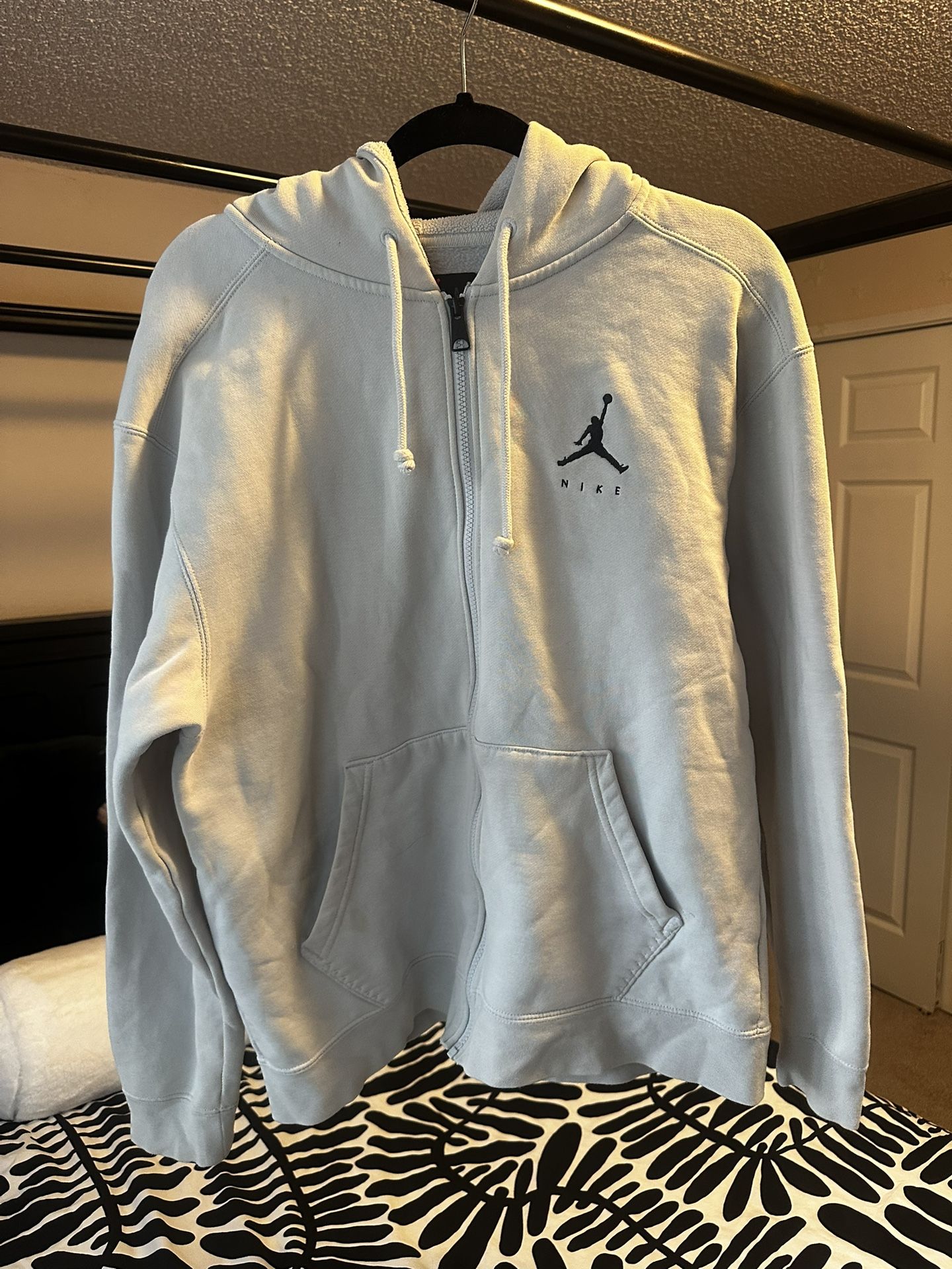 Light grey Nike hoodie with Air Jordan logo. Features a zip-up front and drawstring hood. Thicker sweat shirt fabric. Good quality. Has a few light discoloring as shown in pictures. Has fleece in the hood for warmth.