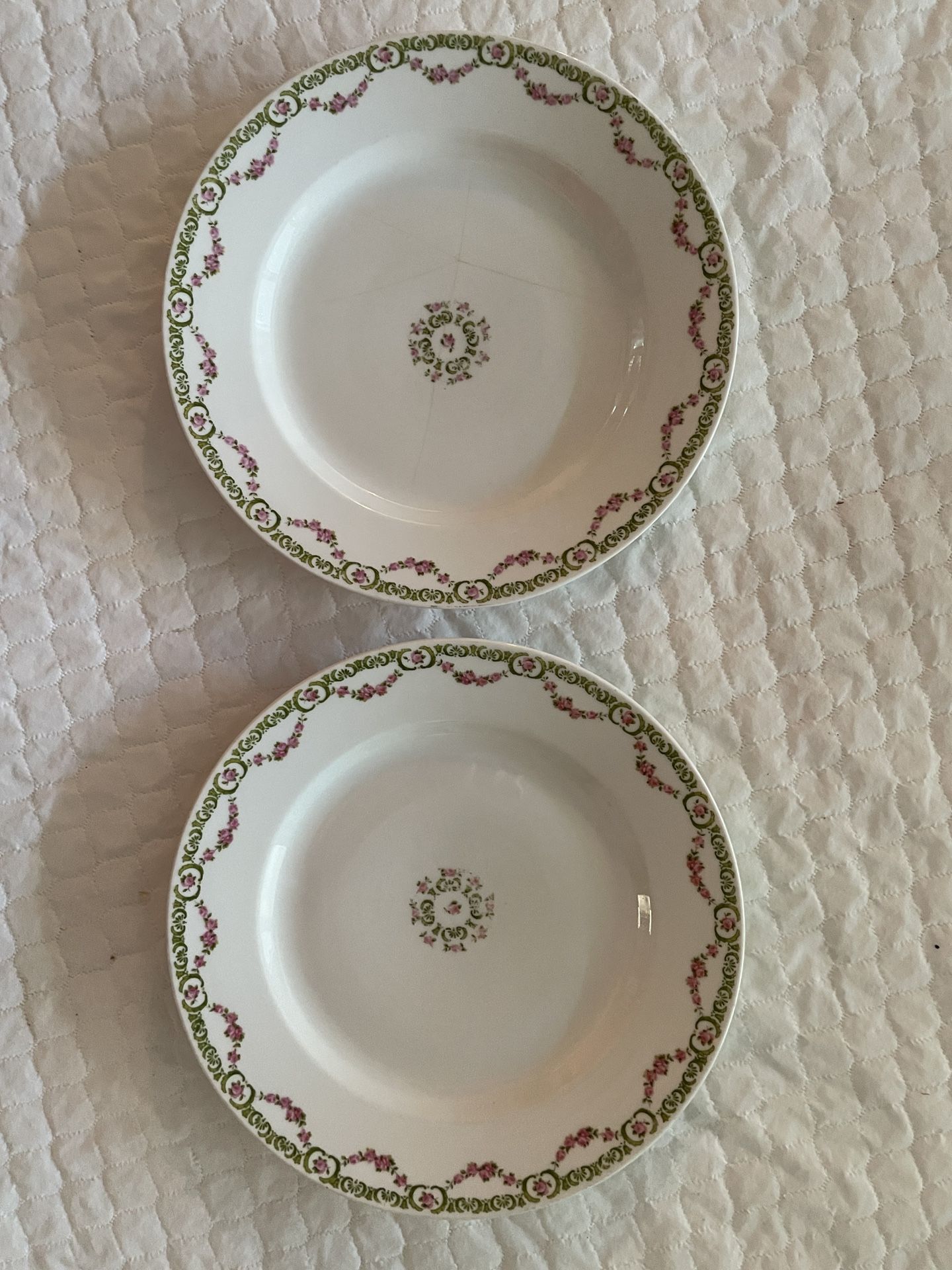 Antique LS&S Carlsbad Austria Porcelain Dinner Plates Pink Rose Garland Set of 2 Brand: L.S. & S. (Lewis Straus & Sons) • Origin: Carlsbad, Austria • Material: Porcelain / China • Pattern: Pink Rose Garland with Green Laurel/Scroll Border • Type: Dinner Plates • Size: Approx. 9.25 inches (diameter) Condition Report: These are antique items and show signs of age. • Plate 1: Good antique condition with minor wear to the pattern. • Plate 2: Shows visible hairline/spider crazing in the center glaze (please see close-up photos). • Both plates have minor shelf wear on the bottom rim. No large chips or heavy staining. These would make a stunning addition to a shabby chic table setting, a wall display, or for a collector of European porcelain.