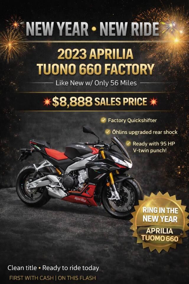 🔥 2023 Aprilia Tuono 660 Factory – ONLY 56 Miles! 🔥 💲 Sale Price: $8,888 📍 Mesa, AZ Basically brand new — only 56 miles. Immaculate condition. Super lightweight, fast, comfortable, and loaded with factory upgrades. ✅ Factory Performance Package ✅ Brembo Brakes ✅ Ride Modes, APRC Traction Control ✅ Wheelie Control ✅ Adjustable Suspension ✅ Quickshifter Perfect for someone who wants superbike performance in a lightweight chassis. Clean title, no issues, no stories. Just a killer bike. 📲 Call/Text 602-900-7633 www.AZAUTORV.com