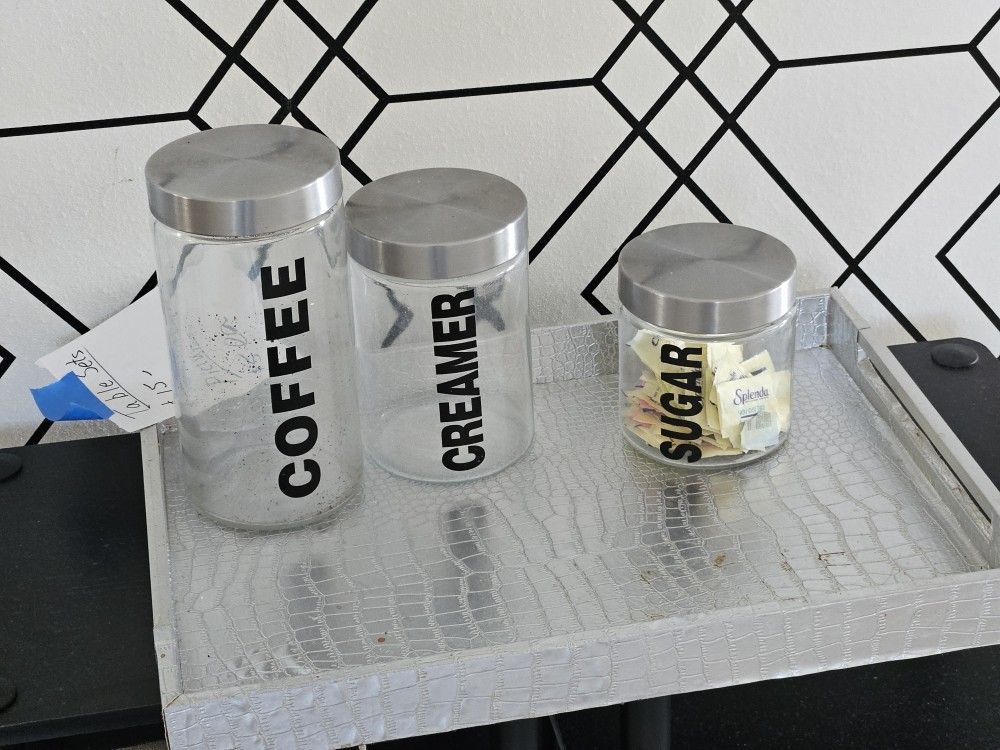 Kitchen/ breakfast tray with coffee, creamer, sugar canisters
