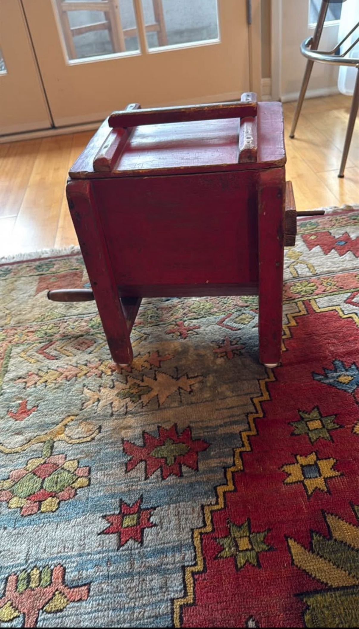 Butter churns like this were essential tools in pre-industrial kitchens, used to convert cream into butter through a process of agitation. The design of these churns varied, but the basic principle remained the same: a container to hold the cream and a mechanism to stir or shake it. These churns were commonplace in homes and farms across America and Europe. This particular style, with its wooden construction and hand-cranked mechanism, reflects the ingenuity and resourcefulness of early American craftsmanship. The red paint suggests it was a cherished item, as paint was a valuable commodity. Today, antique butter churns are collected as examples of folk art and reminders of a simpler way of life.