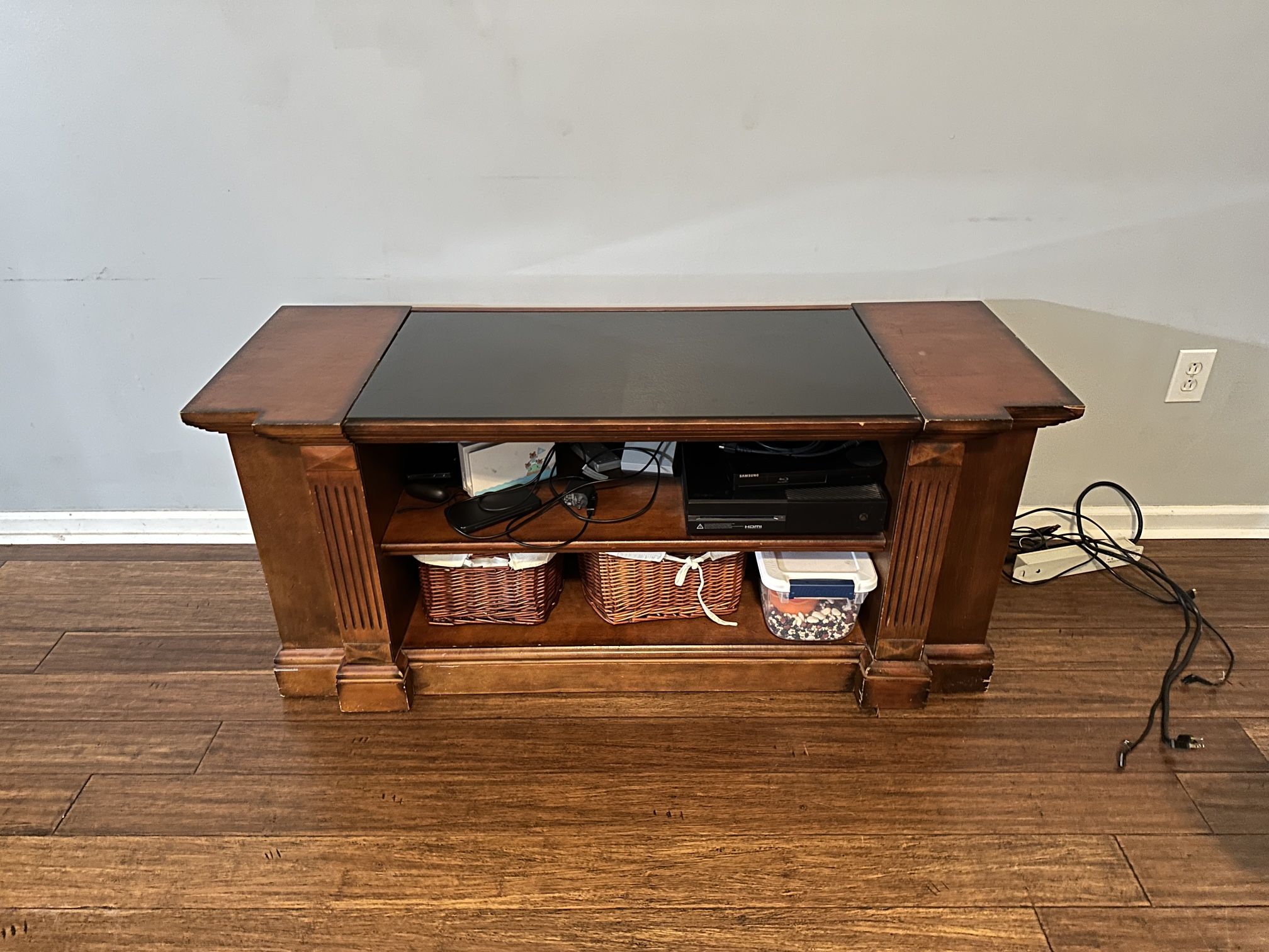 Solid wood and glass entertainment center/tv stand. Has magnetic cabinets on both ends to hold DVDs, video games, remotes, controllers, etc. Has some normal wear around edges but is in great shape! Iβm just looking to change up my decor to a lighter wood π€ Top is smoky tinted glad. Has cutouts in the back to hide wires. 54β wide x 20β deep x 24β high Pickup in Boiling Springs. From a smoke-free π dog-friendly πβπ¦Ί house.