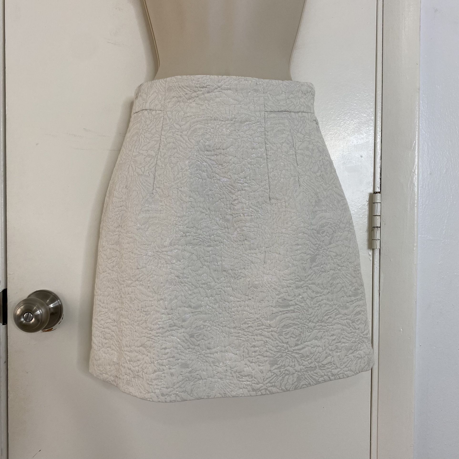 All orders ship 1-3 business days! Women skirt knee length Condition: Preloved, no flaws The color is beige with silver Size US 4 Measurements are approximate; see photos Details: floral pattern; inside button and inner lining. Outfit ideas: nice skirt to wear to work or for a formal outfit Smoke free home!