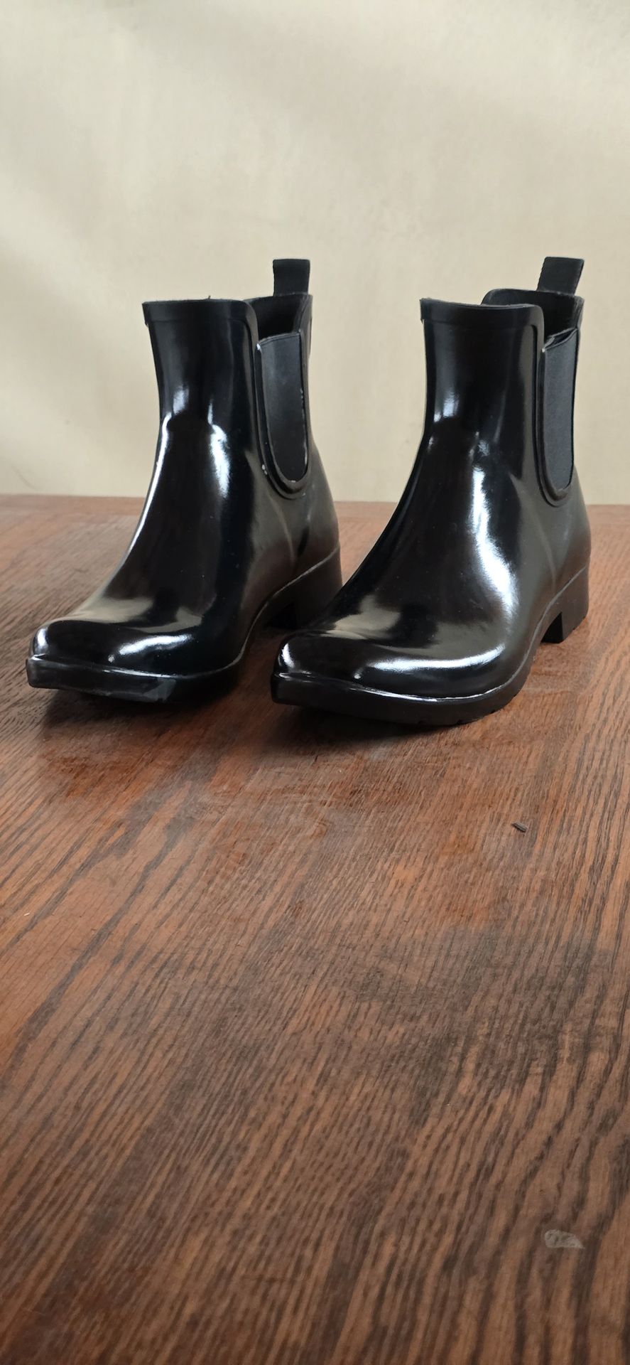 Black Chooka Rubber Boots - Chelsea Style Stylish and practical waterproof Chooka rubber boots. Easy to slip on Chelsea style with elastic side panels. • Waterproof rubber • Comfortable low heel • Great tread • Glossy black finish • Lightweight and comfortable to wear. Federal Way, cash only.