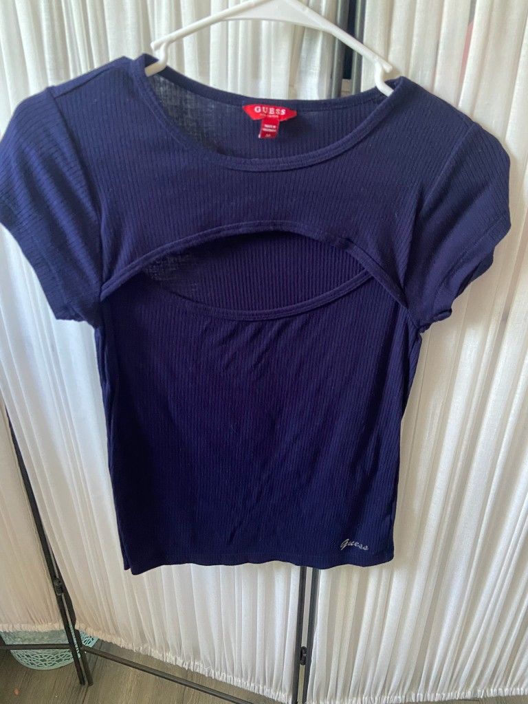 Blue top with cut out in front.