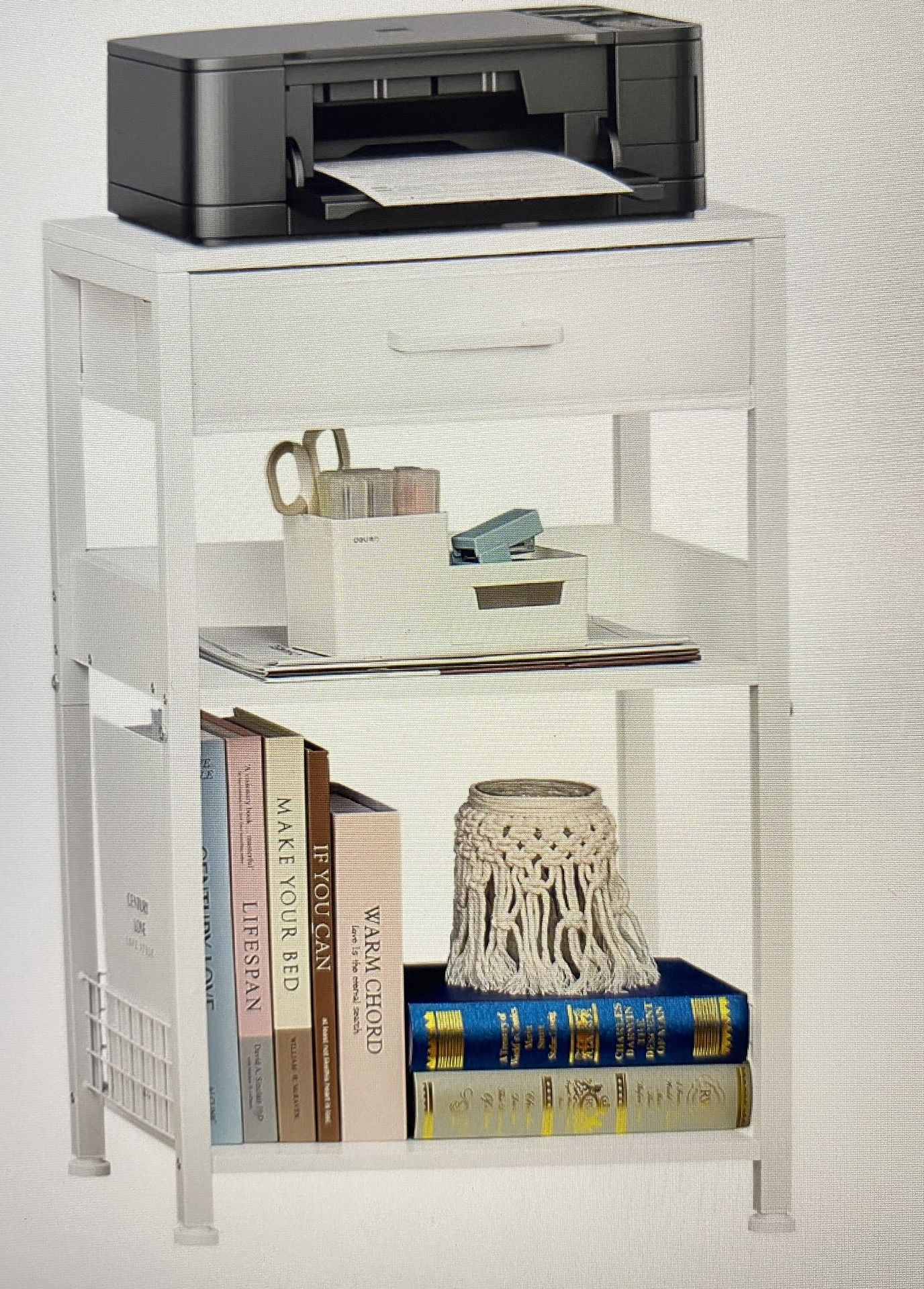 NEW White Printer Stand (need to assemble) . White printer with fabric drawer , 3 tier side table & printer stand . Size 11.8D x 15x75W x 25.79H