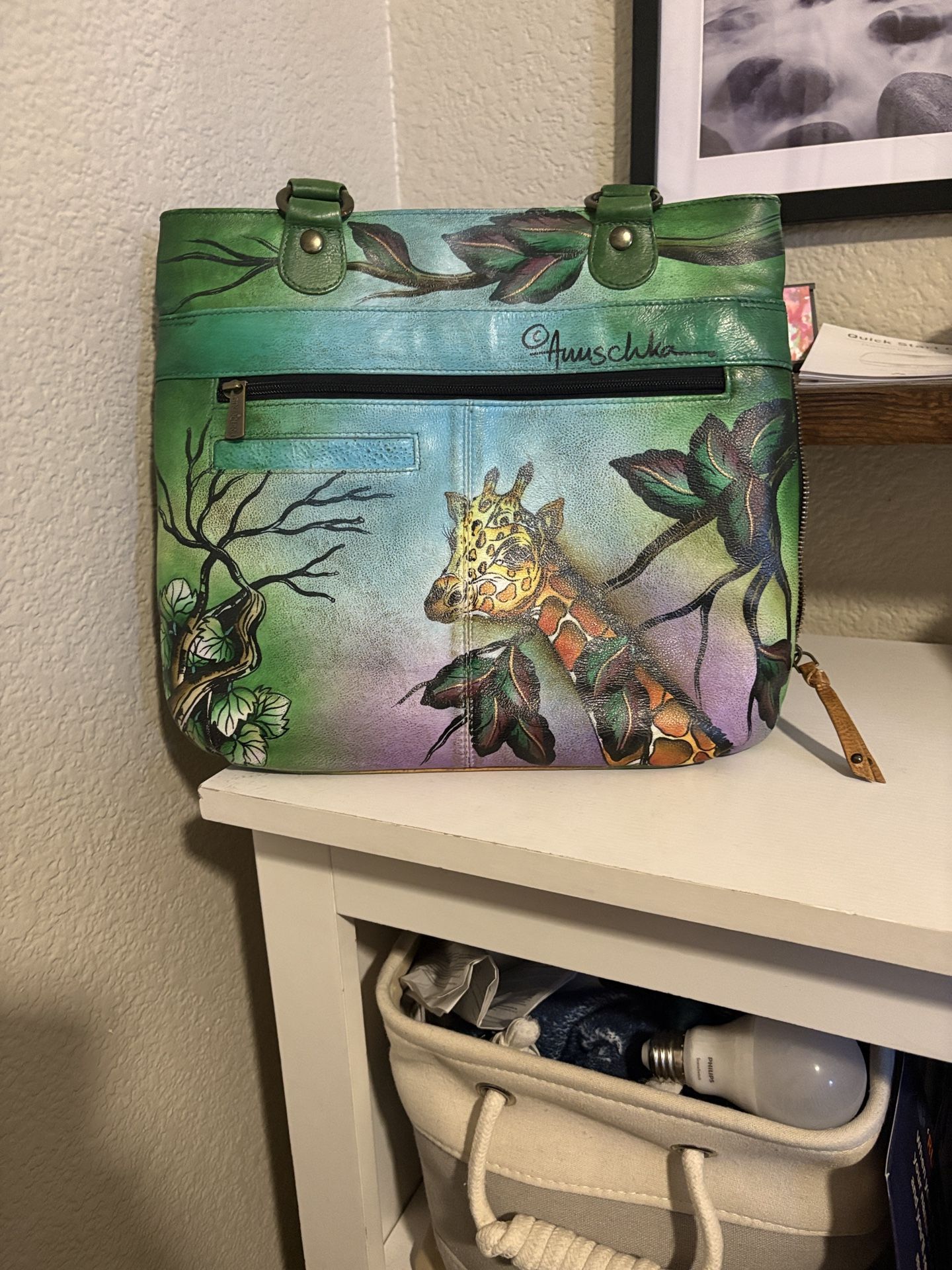 Anuschka's beautifully hand-painted leather handbag showcases an enchanting "African Jungle Adventure" or "African Adventure" theme, adding a touch of exotic charm to your collection.