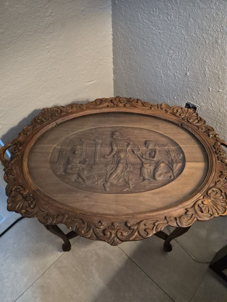 Vintage carved wood coffee table with beautiful ornate detailing and classical design. Solid, sturdy piece with elegant curved legs and detailed carved top featuring a European-style scene. Perfect as a statement piece for a living room, office, or Airbnb setup. Good condition. Minor wear consistent with age.