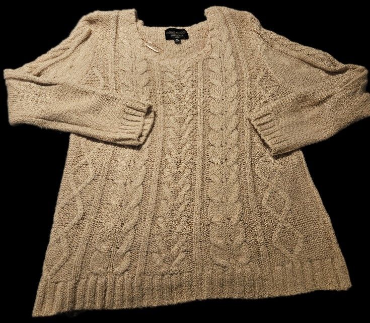 Cable knit design. Soft and warm. Ideal for layering. Never worn.