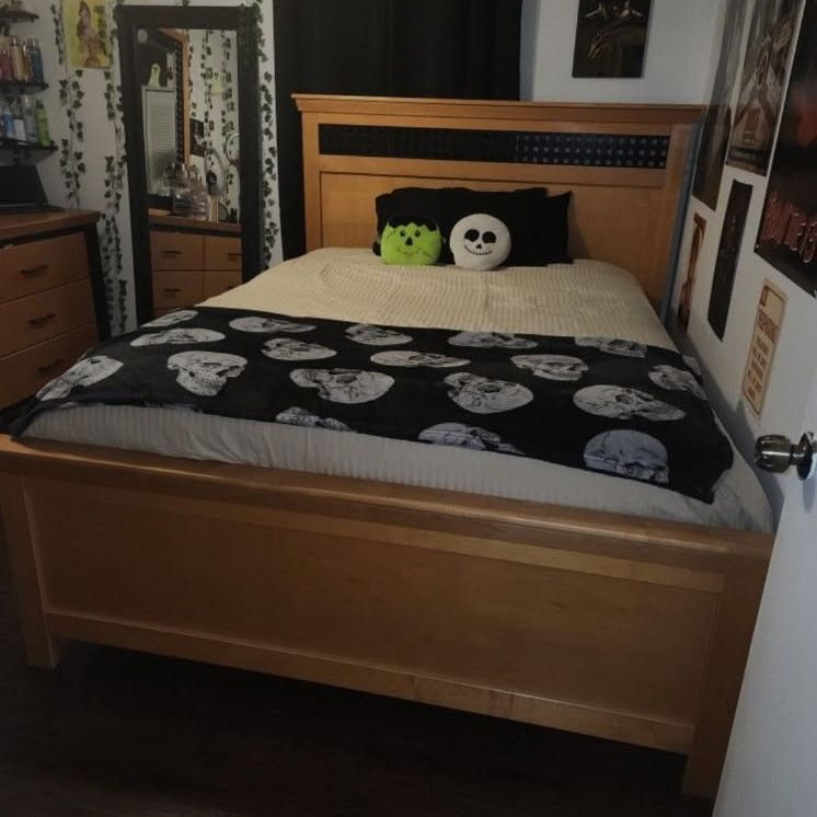 Bed frame (mattress not included) headboard, long dresser with mirror, 2 draw dresser and armoire. $250