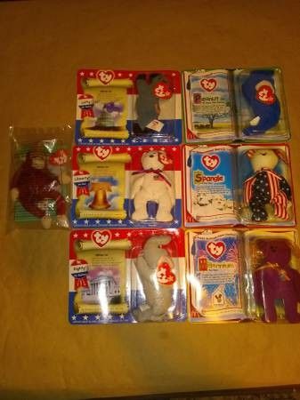 7 Retro Beanie Babies released in McDonalds circa 1996-2000 all still sealed in the original packaging. Included are: -American Trio Libearty -American Trio Lefty -American Trio Righty -Spangle -Millennium -Peanut -Sweetheart the Orangutan $10 for all