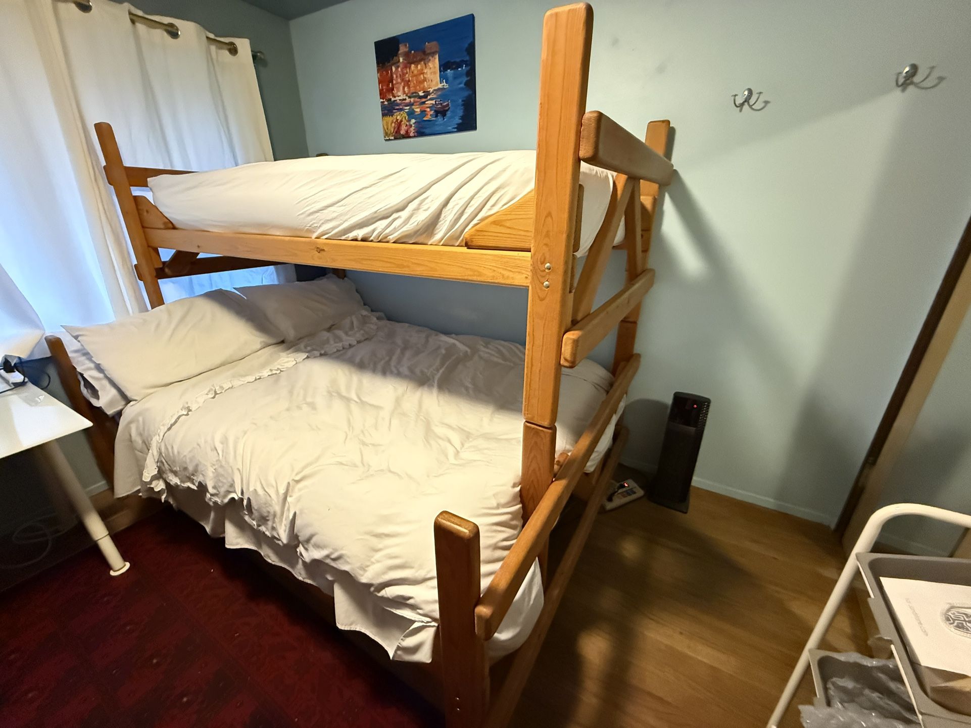 Custom-made bunkbed is built strong. It is perfect for adults or very large and rambunctious kids. It’s all solid wood and heavy construction. The bottom is made for a full size mattress and the top is a twin size.