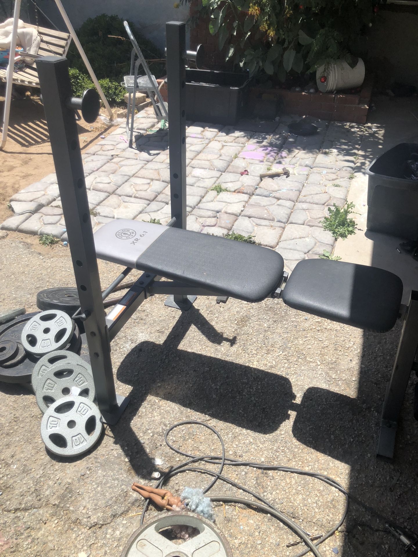 A little rusted but doesn’t leave any rust marks on skin when using it. $400 or just shoot me an offer I’m willing to go down in price a bit 1x Golds Gym XR 6.1 Bench 1x15lbs trainer barbell 1x5lbs ez bar 4x2.2lbs weight plates 2x2.5lbs weight plates 1x5lbs weight plate 1x7.5lbs weight plate 1x8lbs weight plate 6x10lbs weights plates 2x15lbs weight plates 2x44lbs weight plates ^^^^^^^^^^^^^ Everything above goes on the smaller barbell 1x7ft 45lbs Barbell 2x25lbs weight plates 2x10lbs dumbbells 2x20lbs dumbbells