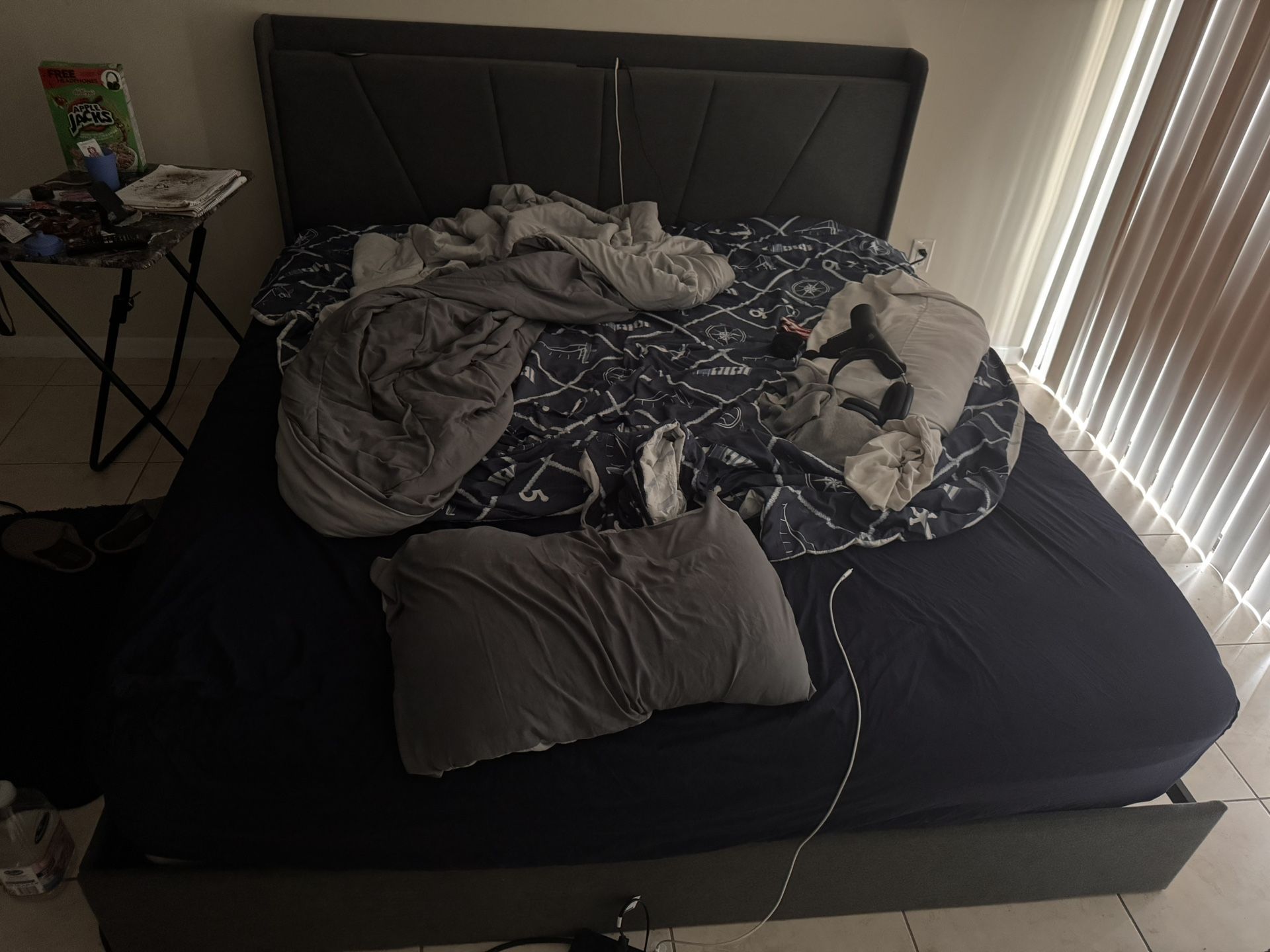 King size bed frame w mattress Mattress is optional Has 2(2prong outlets w 2 usb outlet on top of headboard) headboard comes with board attached 4 pull out rolling draws @ sides of the bed