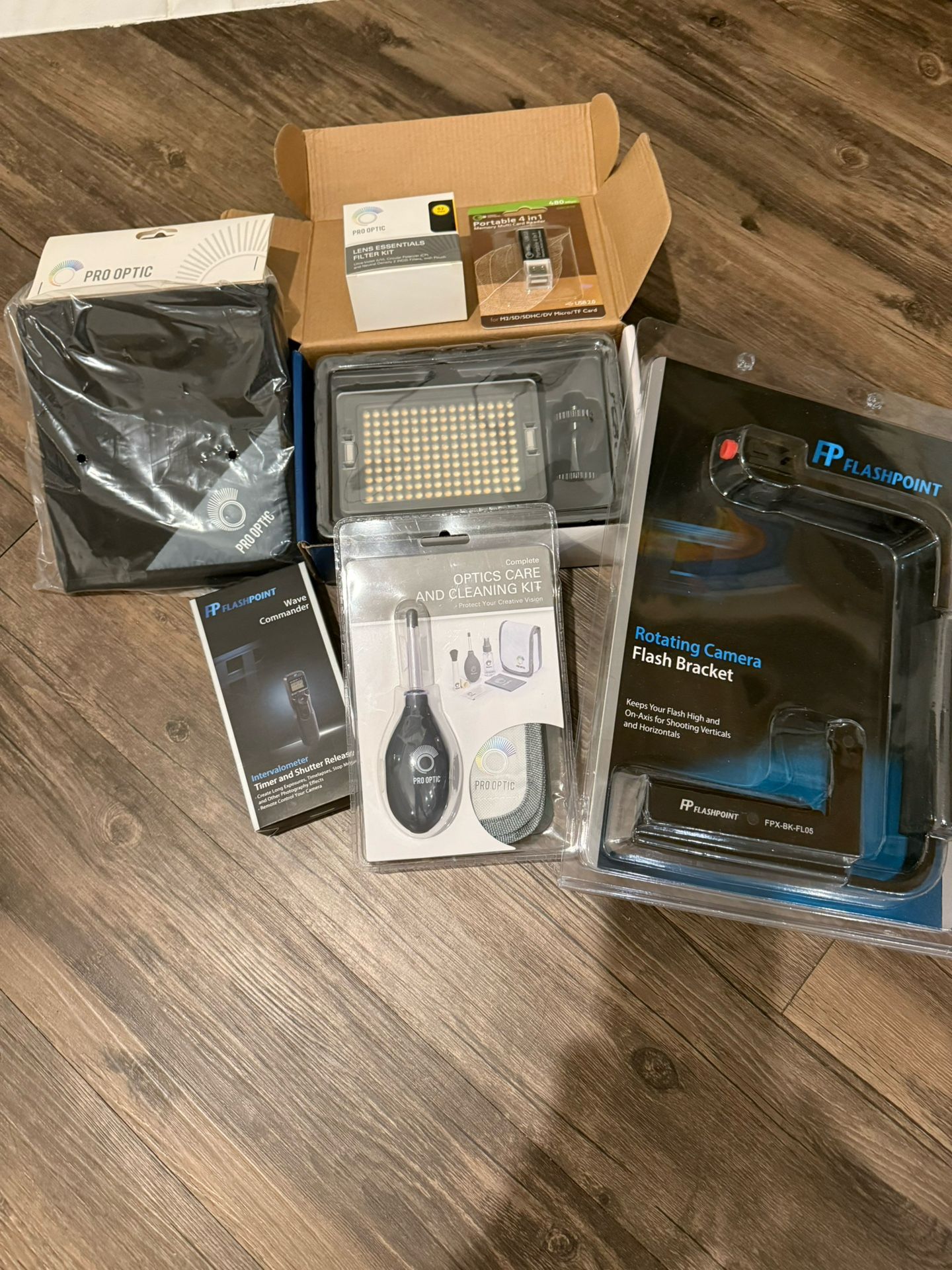 Everything for 55 Pro optic cleaning kit new - value 20 new Pro optic 62 filter kit new value 20 new Pro optic lens wrap 15x15 black new 10 new Flashpoint Wave Commander Wired remote shutter trigger new 30 Clar Phantom 160 bi color on camera led open box requires 6 batteries open box Green extreme cr-10 card reader new 5