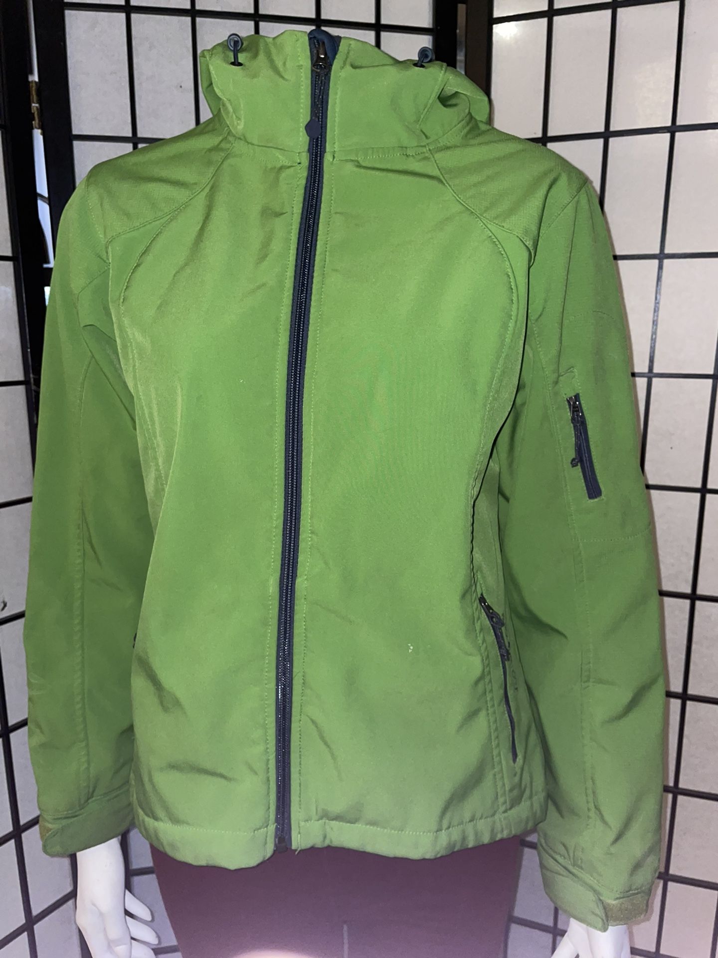 Stylish woman’s jacket great for winter, fall, or spring.thia . The green jacket is size S and is made of softshell fabric with a fleece lining for extra warmth. It features a full zip and long sleeves with a mid-length jacket/coat length. this activewear jacket, is perfect for outdoor occasions. The jacket is in like new condition.