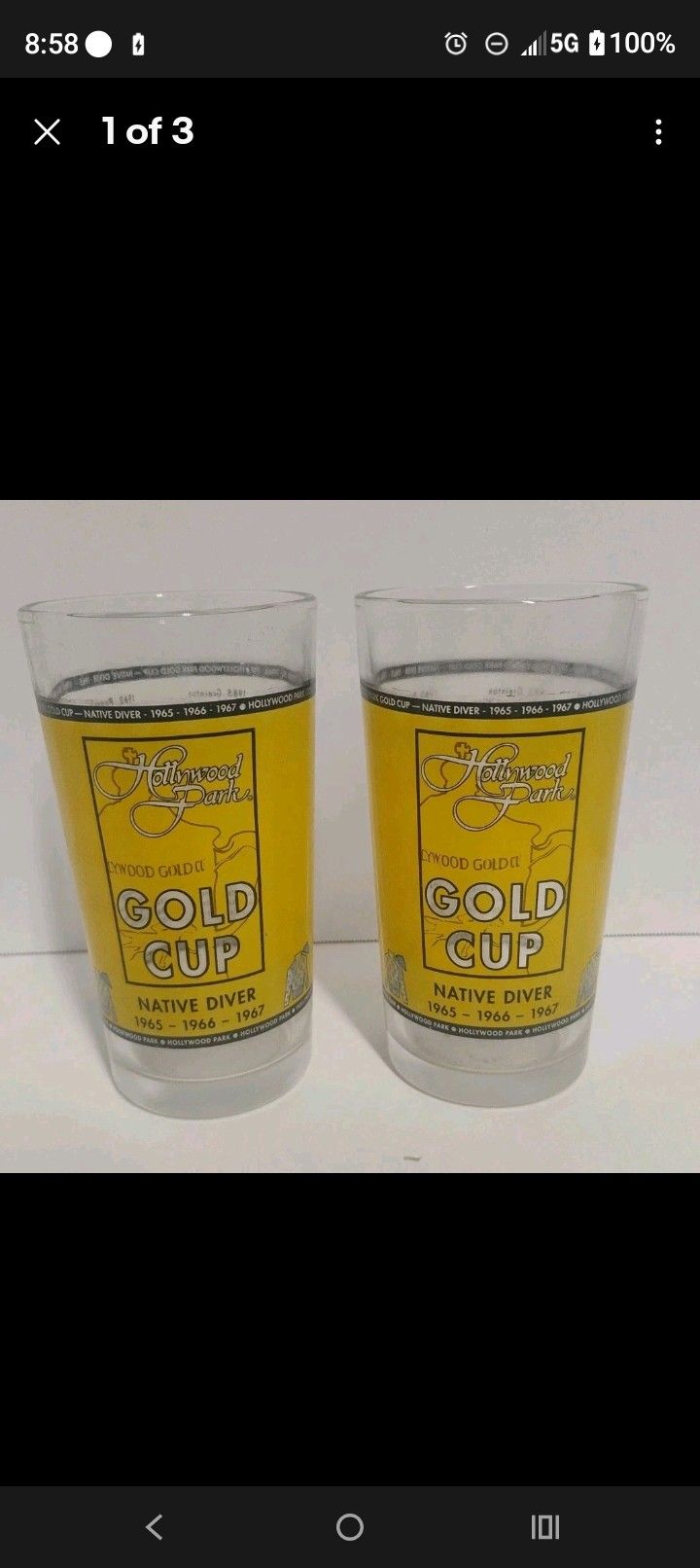Set Of 2 Hollywood Park Gold 5" Cup Collectible Glass Native Diver Horse Racing
