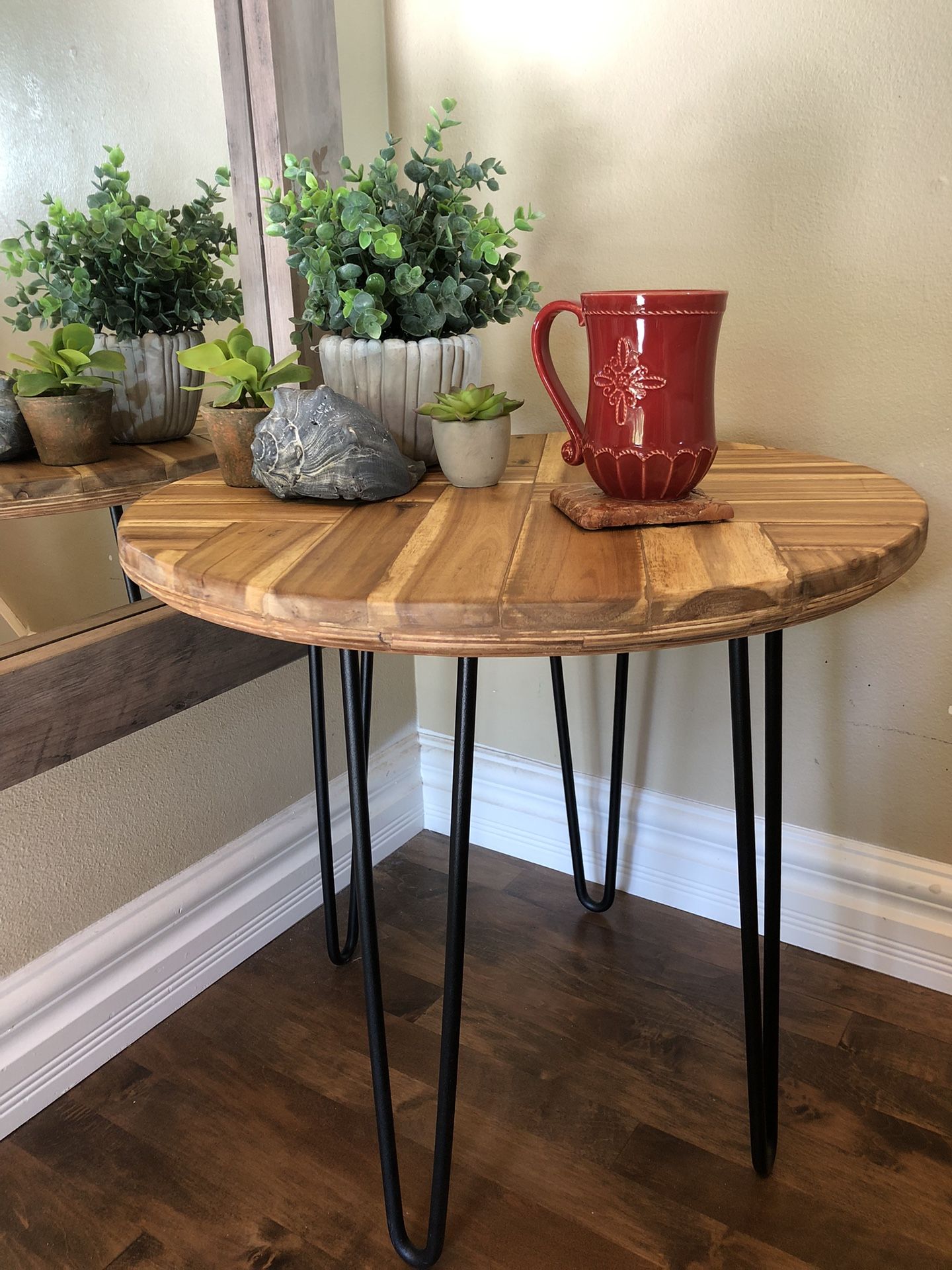 This is a custom made, end table/coffee table that would be a great addition to any farm style, modern, rustic, and shabby sheik decor ect… The table top is made from reclaimed pallet wood. The dimensions are (tabletop) 22 1/2 inches (height) 20 inches. Feel free to reach out with any questions