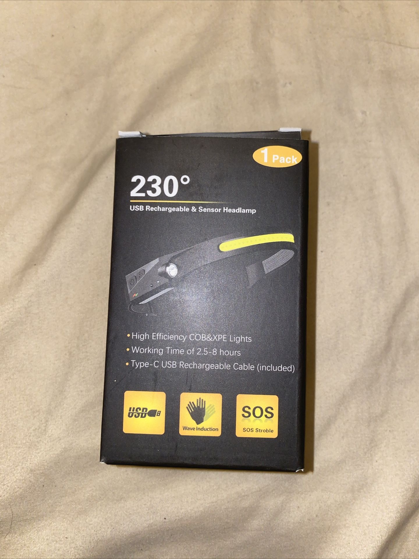 230 Degrees USB Rechargeable & Sensor HeadlampW/USB Charger Cord-Works 2.5-8hrs