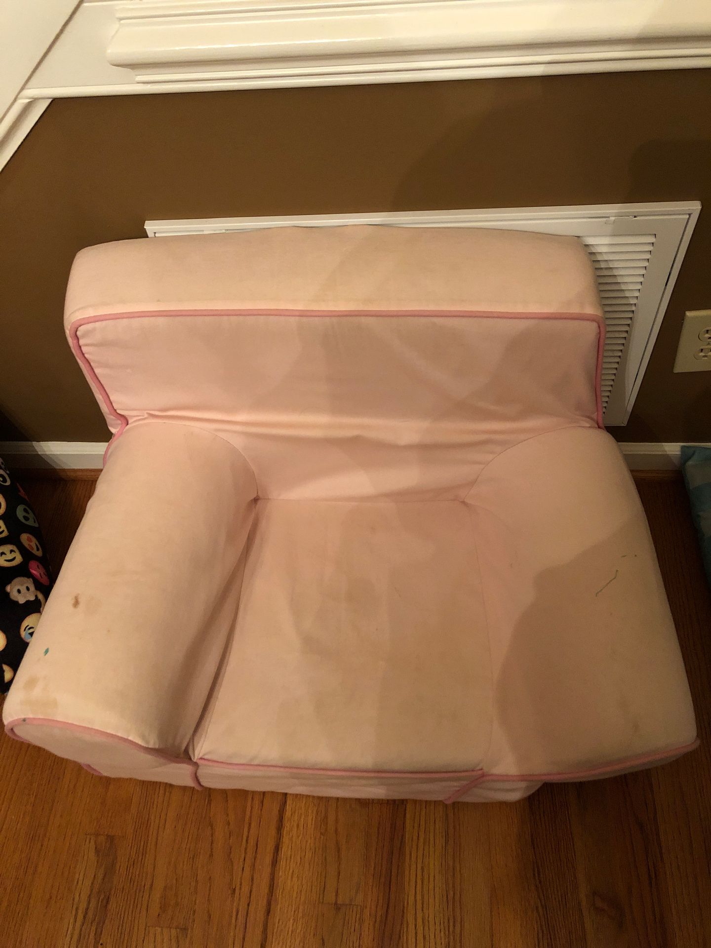 Need a comfortable seat for your kids to sit in here’s a pink play kid chair. Very comfortable. No rips or tears. The cover is removable and washable to get out the messes that can get on there.