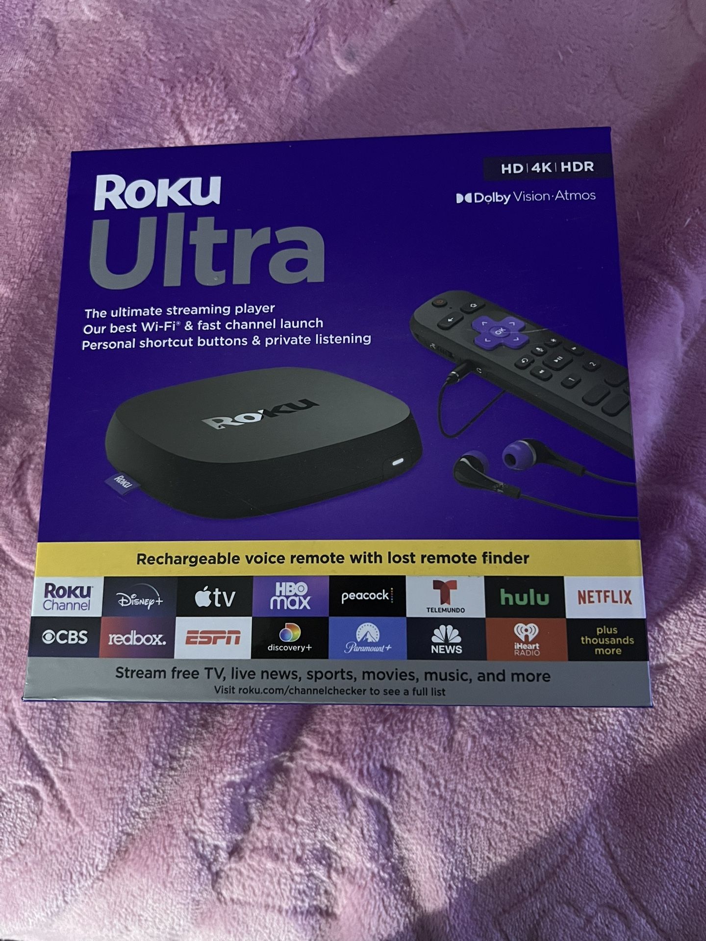 Roku Ultra 4k streaming device. Brand new, never used. Lost remote finder, private listening feature, and rechargeable remote, plus more! We realized our tv already came with Roku installed, send offers!