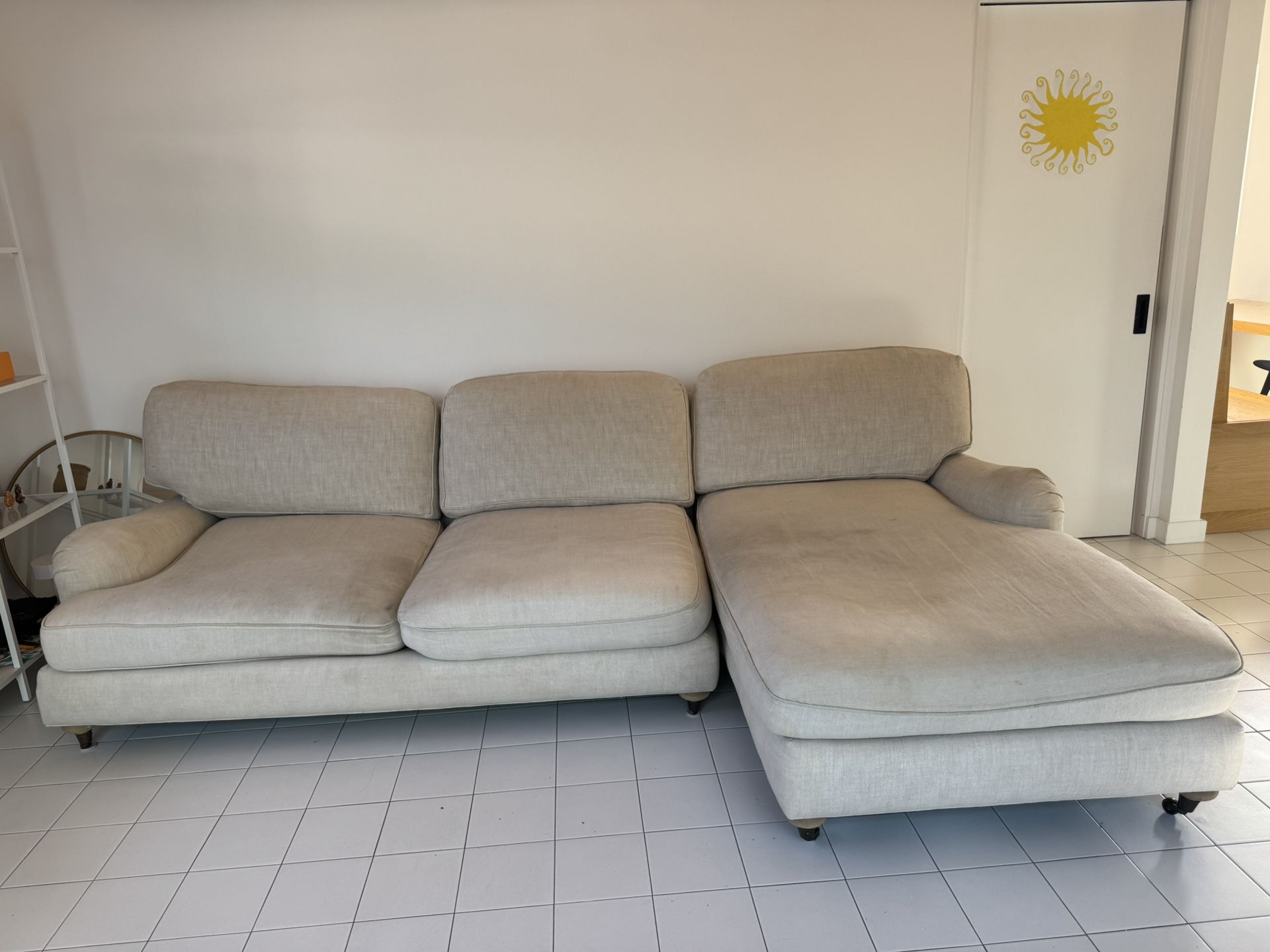 Restoration hardware sofa Boho Chic Super comfy, cleaned professionally every few months Heavily loved, lightly stained Have 3 matching pillows if wanted Comes in two pieces