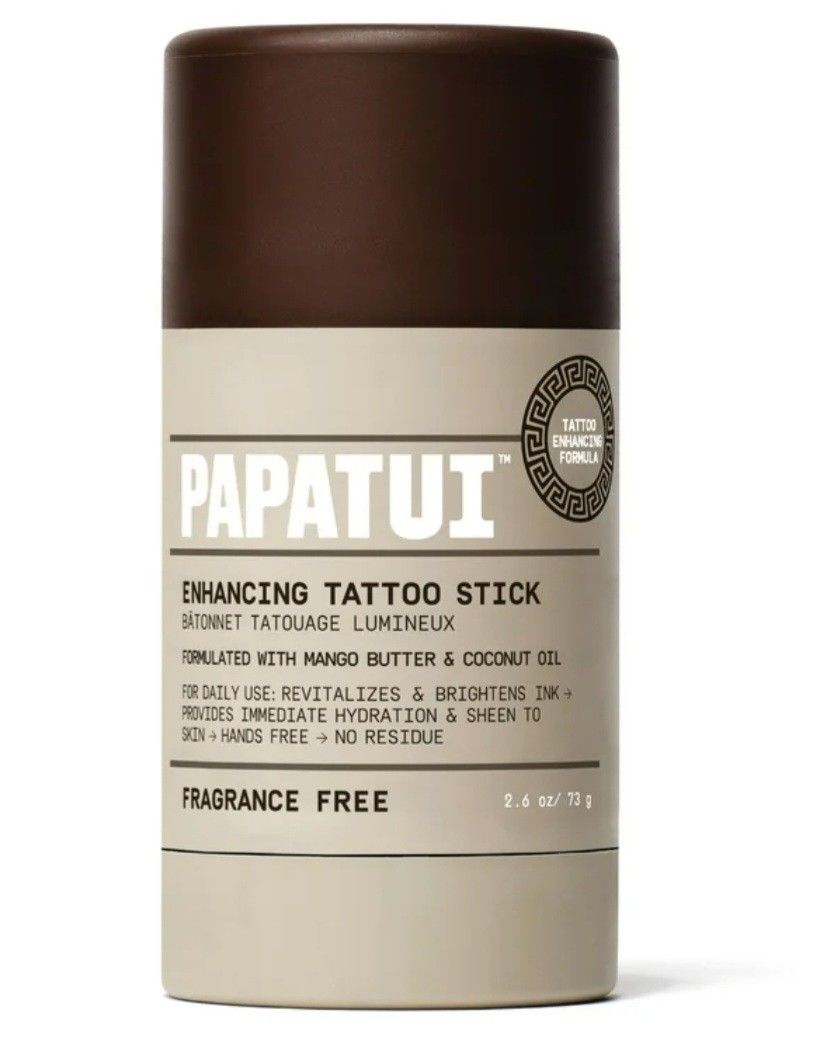 Revitalize and brighten your ink with the Tattoo Enhancing Stick. Perfect for daily use. Keep your ink bold, vibrant, and protected with Papatui Enhancing Men's Tattoo Stick, Unscented 2.6 oz. This stick is crafted specifically for men who take pride in their tattoos. The gentle, unscented formula is ideal for all skin types and daily use, delivering hydration without irritation. Made with natural oils, it nourishes and revitalizes your skin while enhancing the color and contrast of your tattoos. No greasy residue, no mess, just a smooth, easy application that won’t transfer to clothing. This stick is perfect for tattoo care and helps protect against fading, dryness, and daily wear but not recommended for fresh tattoos. Papatui Tattoo Stick keeps your artwork looking sharp. Maintain your ink with confidence and choose Papatui, a men's grooming line founded by Dwayne "The Rock" Johnson.PAPATUI - Men's Skincare by Dwayne "The Rock" Johnson Rejuvenates, protects, and brightens tattoo vibrancy while hydrating skin without residue. Dermatologist-tested. Made with Jojoba Oil and Vitamin E for Paraben-free, phthalate-free, cruelty-free, vegan 97% of men found the formula easy to apply, 95% said it provides full tattoo coverage, and 4 out of 5 saw brighter. Both stick and balm pictured are sold together #DASD062225