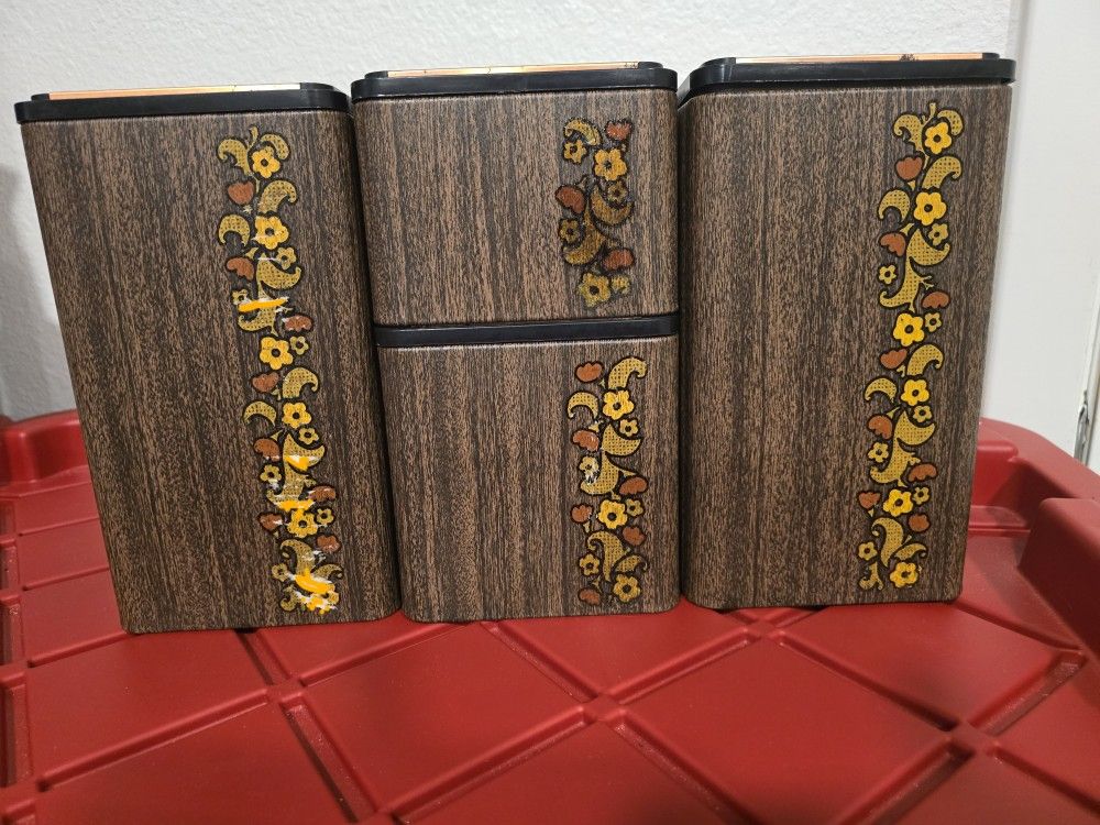 Vintage Flower Power Kitchen Canisters Yellow Avocado Faux Wood Metal 4pc