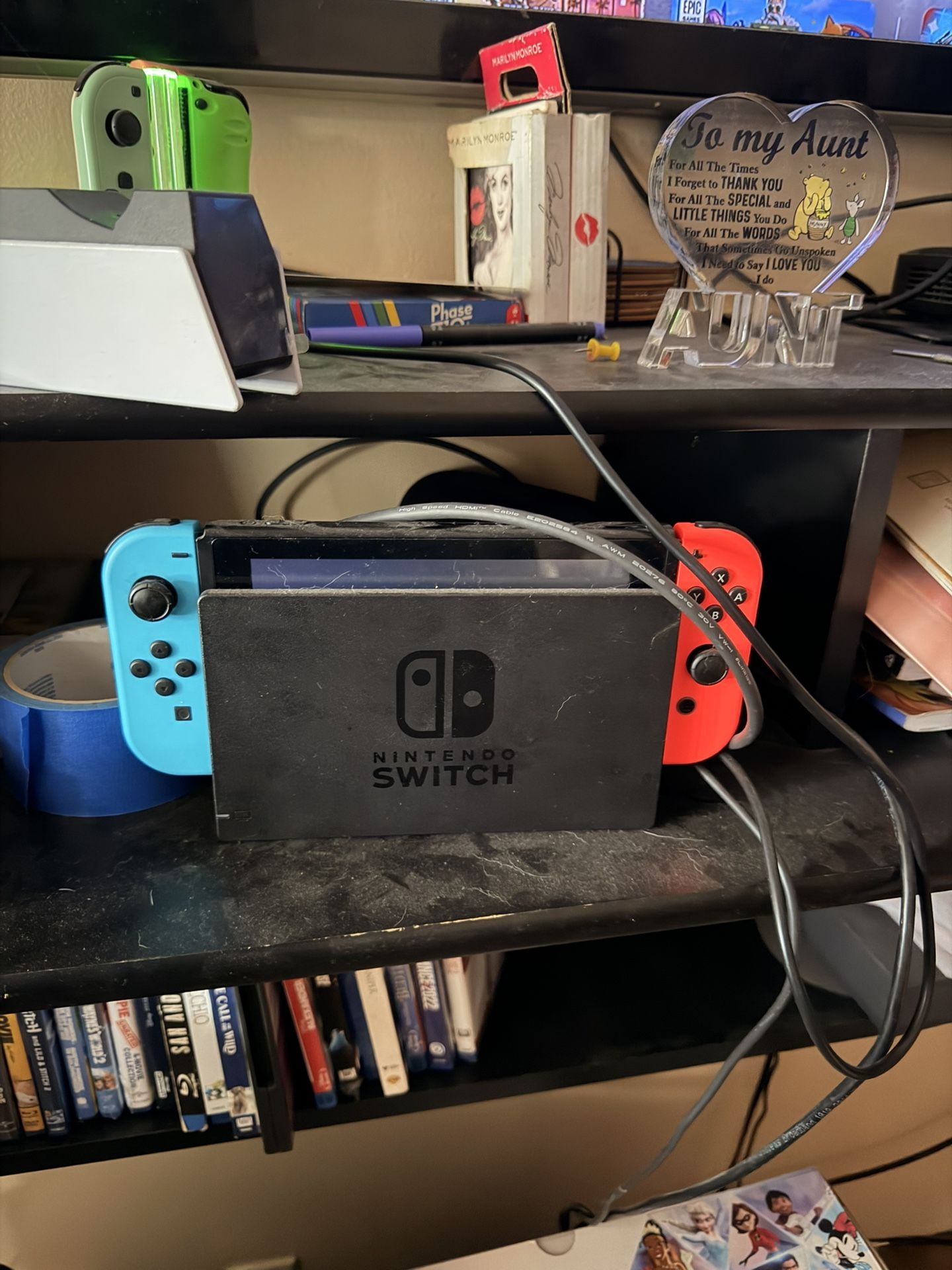 Switch in good condition comes with 3 extra controllers , controller charging station , and 10 games . Selling as a bundle.