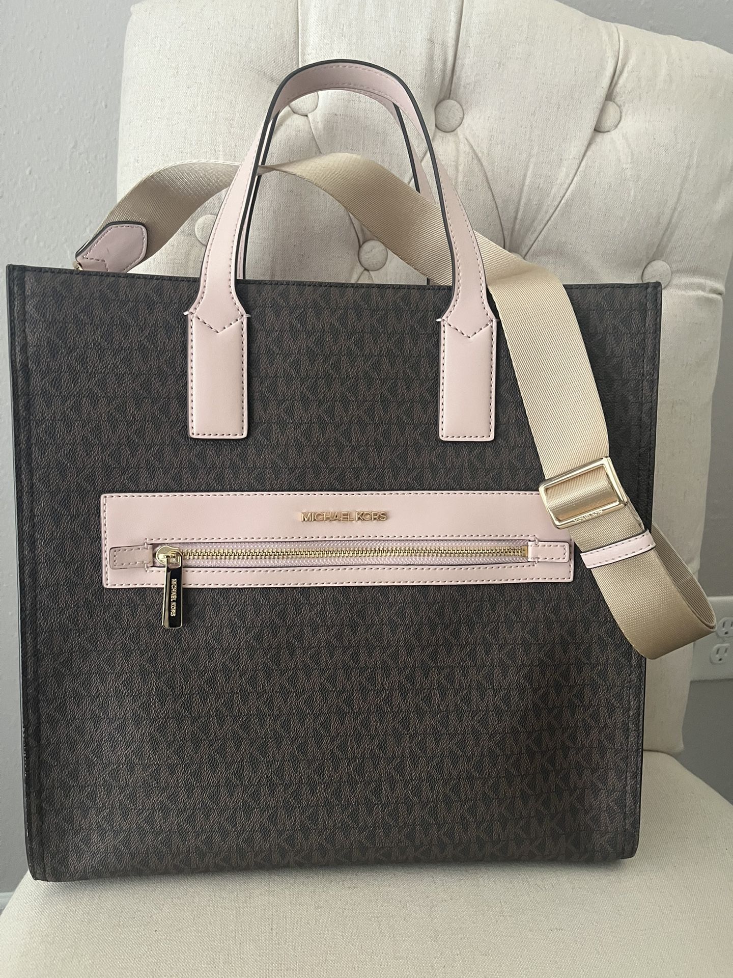 Open to negotiation on price. Brown handbag with light pink trim. Has gold strap to make into a crossbody. Great condition. Only worn twice.