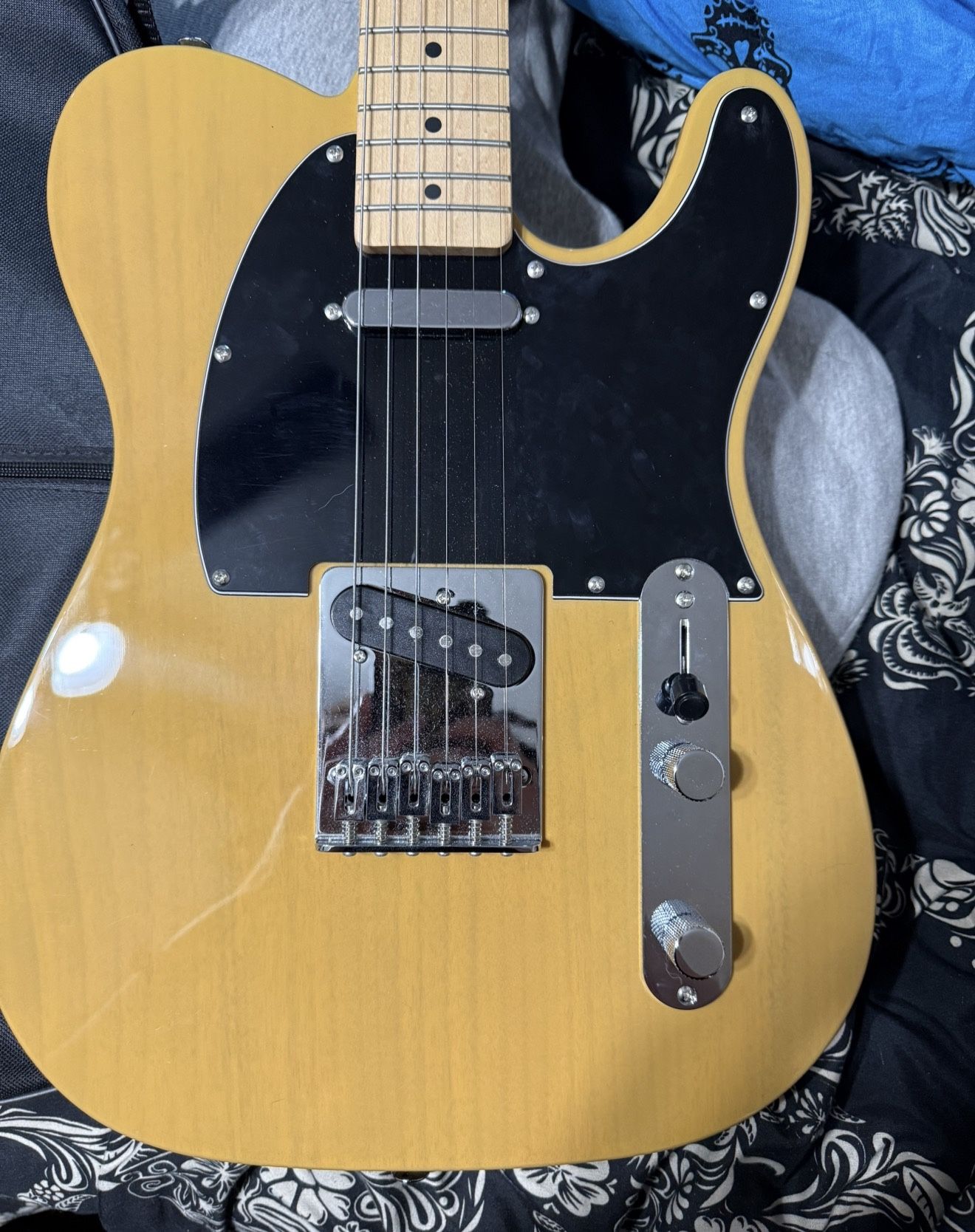 Squier Telecaster by Fender in classic blonde finish. Features dual single-coil pickups with that iconic Tele twang. Plays and sounds great, normal light cosmetic wear from use. Perfect for beginners or anyone looking for a reliable, versatile electric guitar. Comes with gig bag.