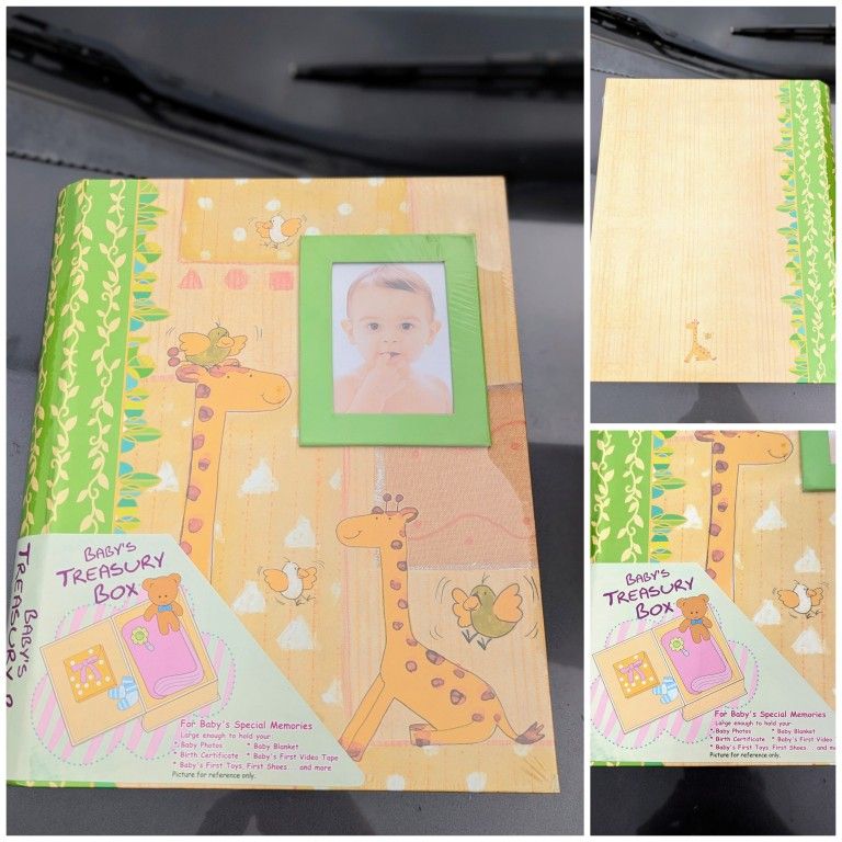 This spacious memory box includes a photo album, memories book, memory cards, keepsake pouch, and drawers. Baby's first keepsake memory box / shower gift / boy / girl / unisex / yellow / giraffe / bird Inside photo may not reflect same color and design as the unit you are purchasing. Outside design is the design you are buying. #77