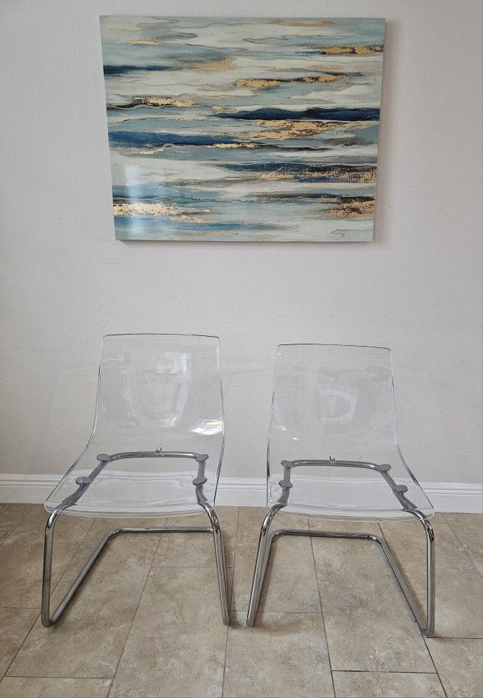 Comfortable, modern, sturdy chairs. Look very nice in any space. It mirrors its surroundings, picks up the colors of the room and appears to be floating. Excellent conditions. Capacity: Up to 243 lbs. ea. Material: Leg frame: Steel, Chrome plated Seat shell: Polycarbonate plastic Foot: Polypropylene Measurements: Width: 21 5/8 " Depth: 22 " Height: 32 1/4 " Seat width: 18 7/8 " Seat depth: 18 1/8 " Seat height: 17 3/8 "