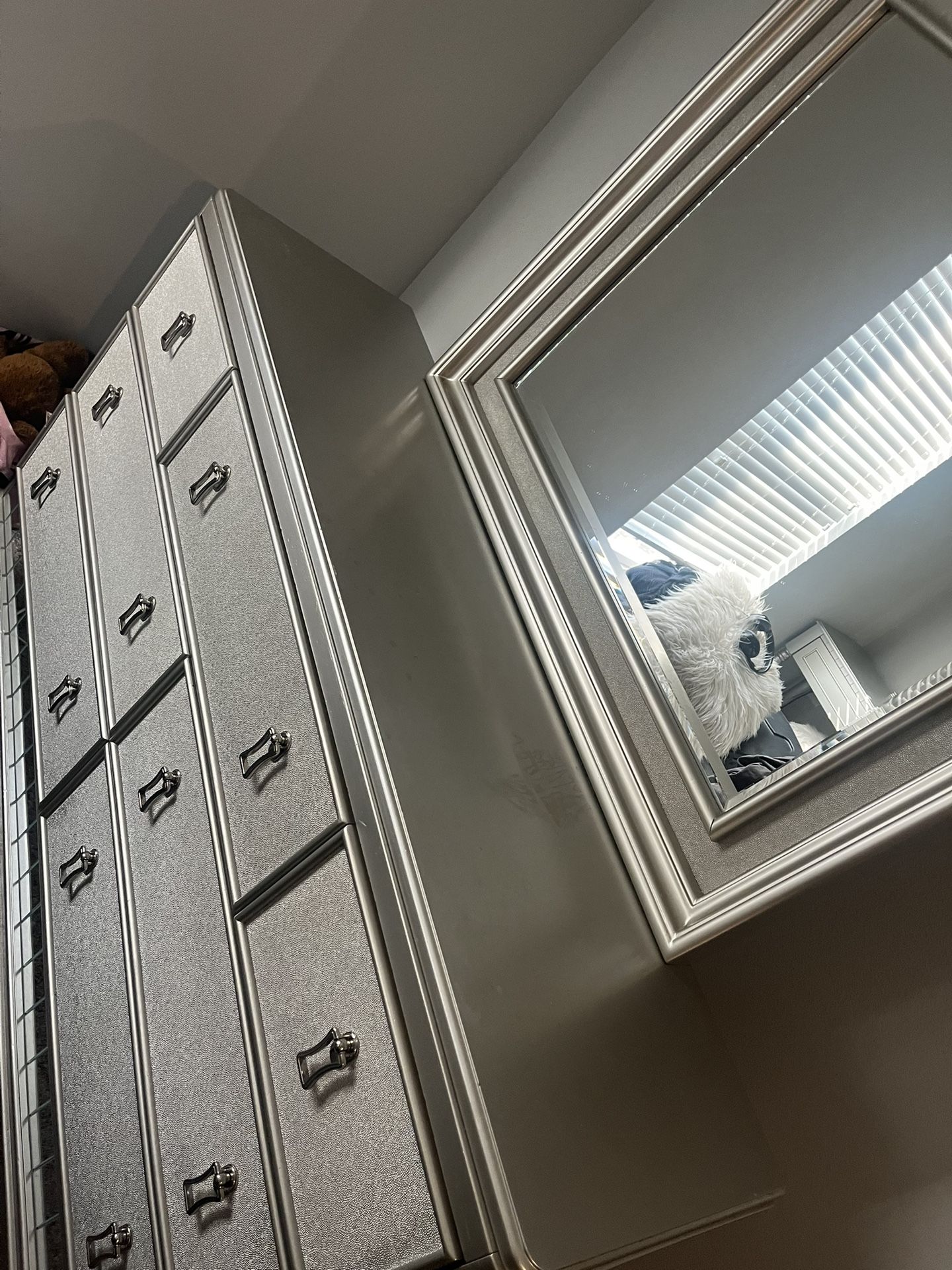 Beautiful silver bedroom set that includes a 6-drawer dresser with matching framed mirror and bed. Condition: This set is not in perfect condition, but it is fully functional and still very pretty once decorated. Includes: • ✔️ 6-drawer silver dresser • ✔️ Large matching framed mirror Features: • Elegant silver metallic finish • Plenty of storage space • Perfect for a glam bedroom or beauty setup Ideal For: ✨ First apartments ✨ Guest rooms ✨ Teens/college students ✨ DIY or furniture-refresh projects (paint, cover tops, etc.)