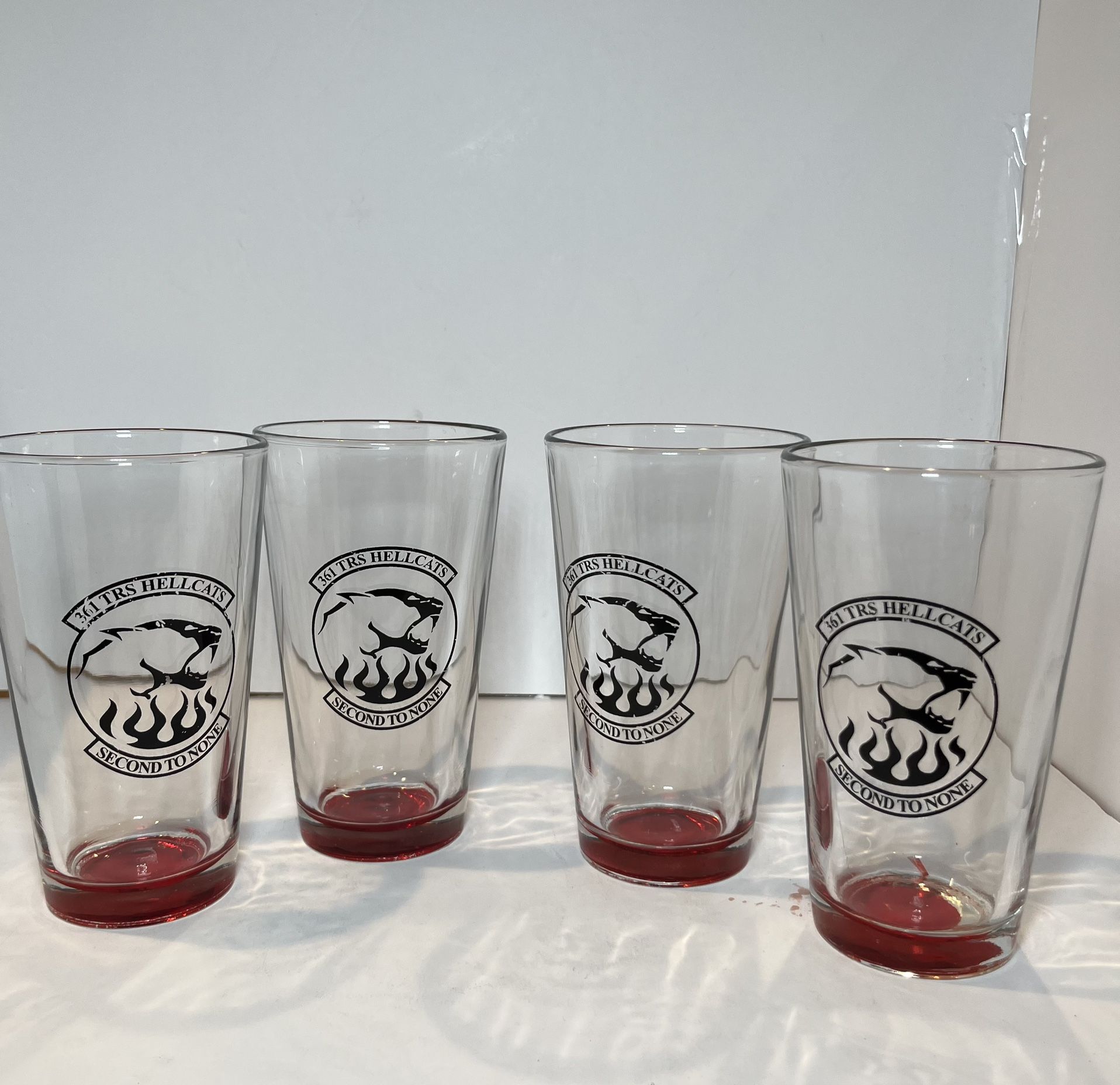 This glassware set of 4 is a must-have for any military enthusiast, particularly those interested in the Air Force. Featuring the iconic Hellcats emblem of the 361 TRS, these glasses are a perfect addition to any collection or as a gift for a fellow veteran or active-duty service member. The attention to detail and quality of these glasses is unmatched, making them not only a great display piece but also functional for everyday use. Show your pride and support for the brave men and women who have served in the Air Force with this unique and timeless glassware set, one has slight imperfection on the bottom