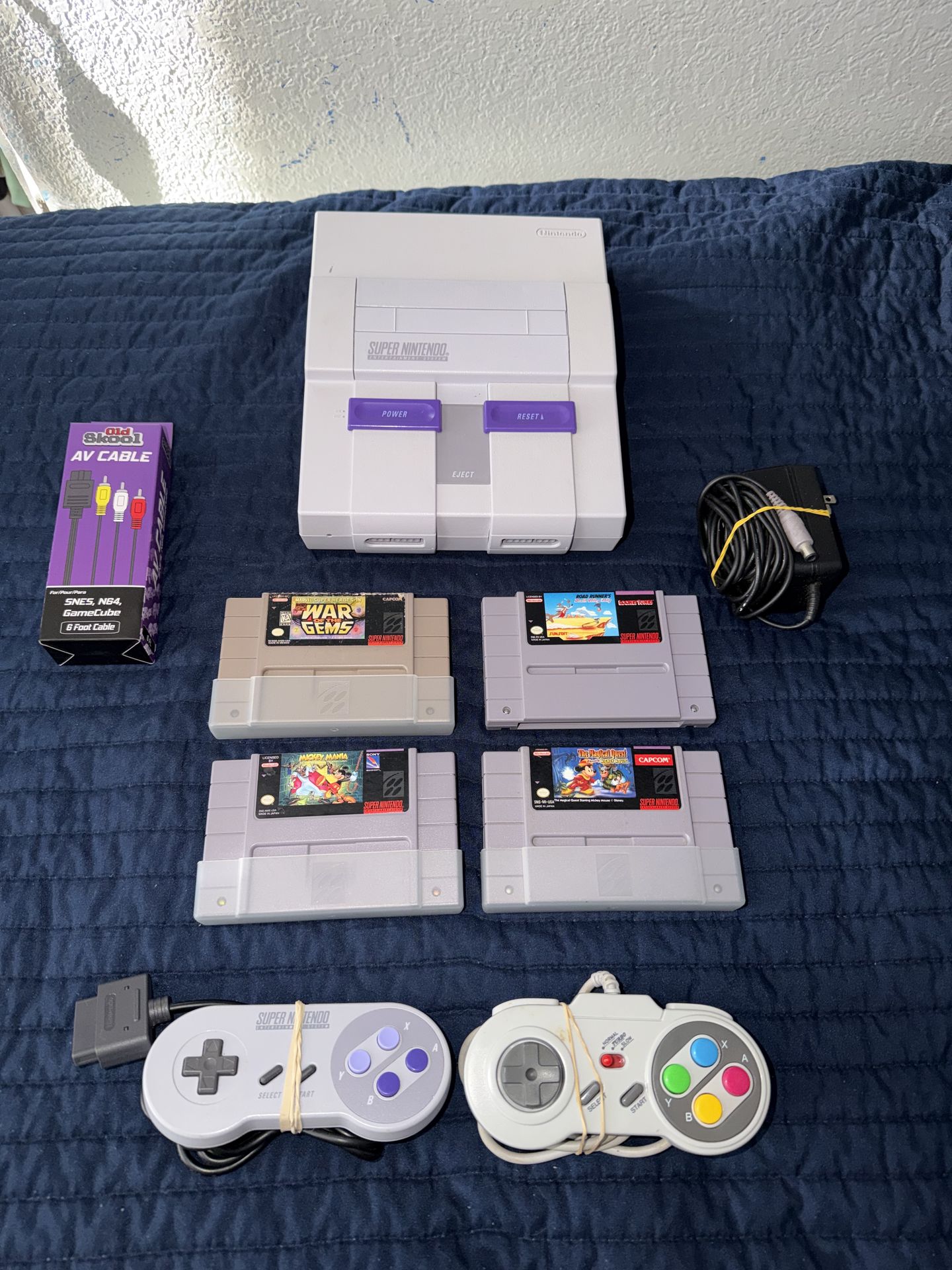 I have a godly SNES Bundle. Console is super clean from the looks of it. As well as the controllers. Looks like it was taken care of well. Comes with 4 games in great condition, except for X-men. X-men has more wear but still plays. You’ll get the original power cord, av cable and two controllers as well. Everything is tested and working great! Will be shipped out asap OBO