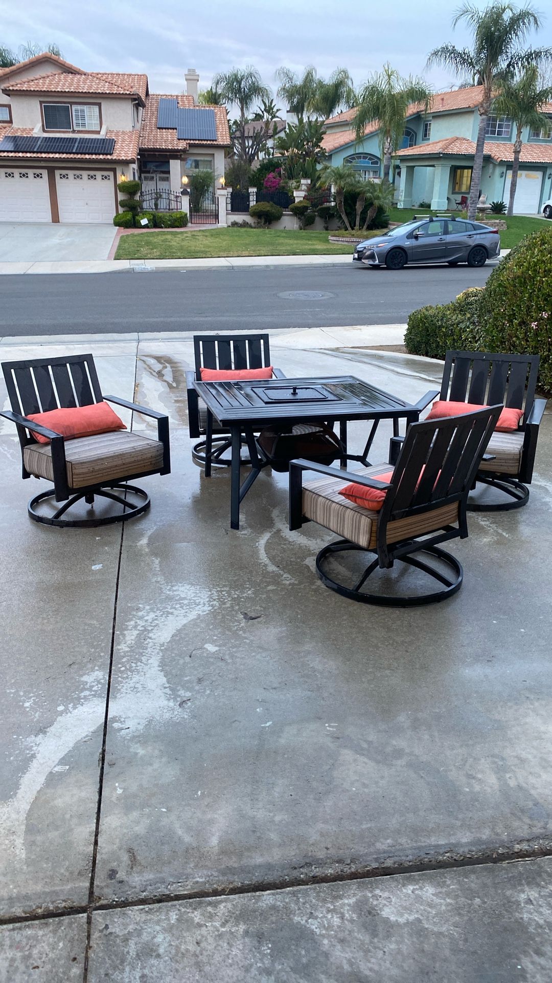 Pretty cool 4 person fire pit . Chairs are in decent shape no tears. Used for outdoor 4th July and Halloween parties .