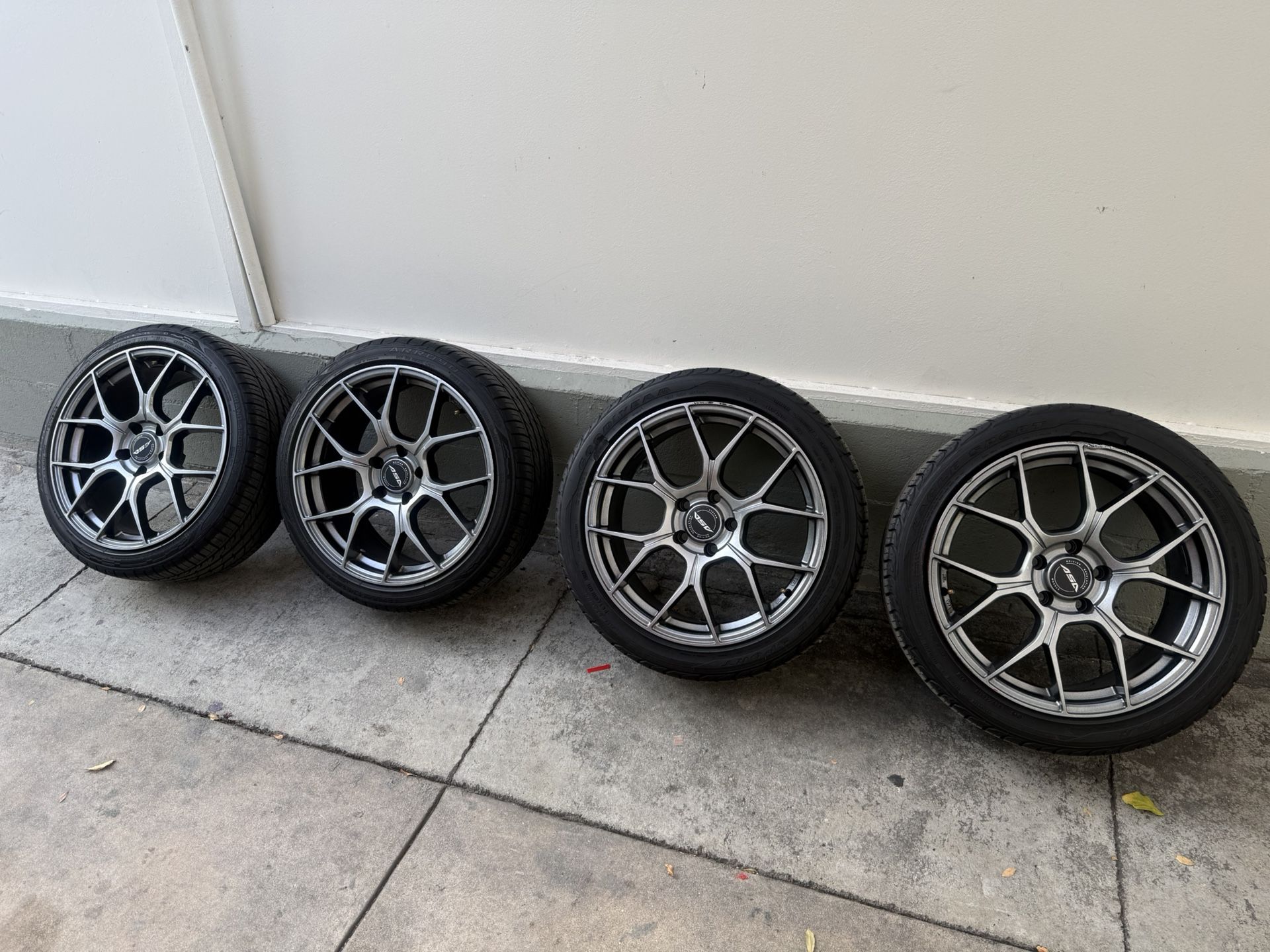 No cracks/bents on any rim, 2 new tires 2 used tires for sale or trade Fronts 225 rear 245 18x8