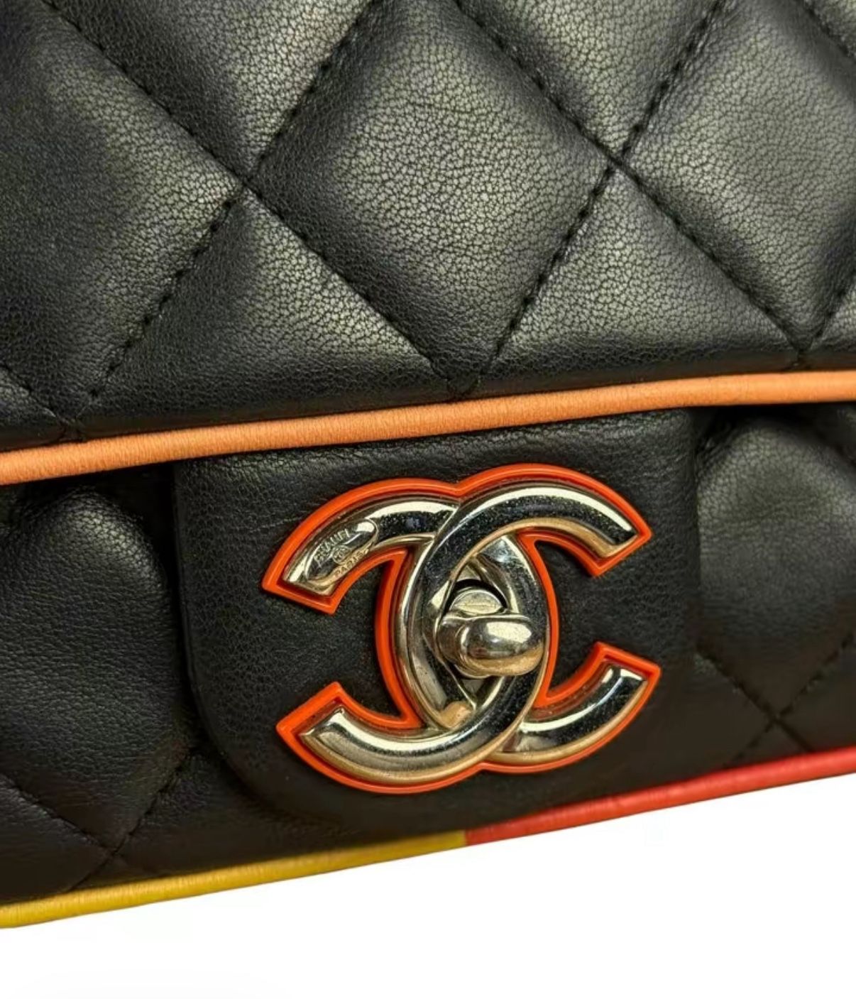 This vintage CHANEL Cuba Medium Single Flap Bag exemplifies bold sophistication with its black quilted lambskin leather, striking multicolor leather trim, and distinctive silver-tone plexiglass hardware. In very good condition, this beautifully preserved piece features a versatile convertible chainlink strap and practical exterior pocket, complemented by a refined black interior. Whether you're attending a glamorous evening event, enjoying an upscale dinner, or seeking to make a statement at social gatherings, this unique CHANEL creation brings authentic luxury and artistic flair to any ensemble whilst celebrating the brand's innovative design approach. Show more • Black quilted lambskin with multicolour leather trim • Silver-tone and multicolour plexiglass hardware • Convertible chain-link shoulder strap • Exterior back pocket and one interior zip pocket • Black lining • Vintage