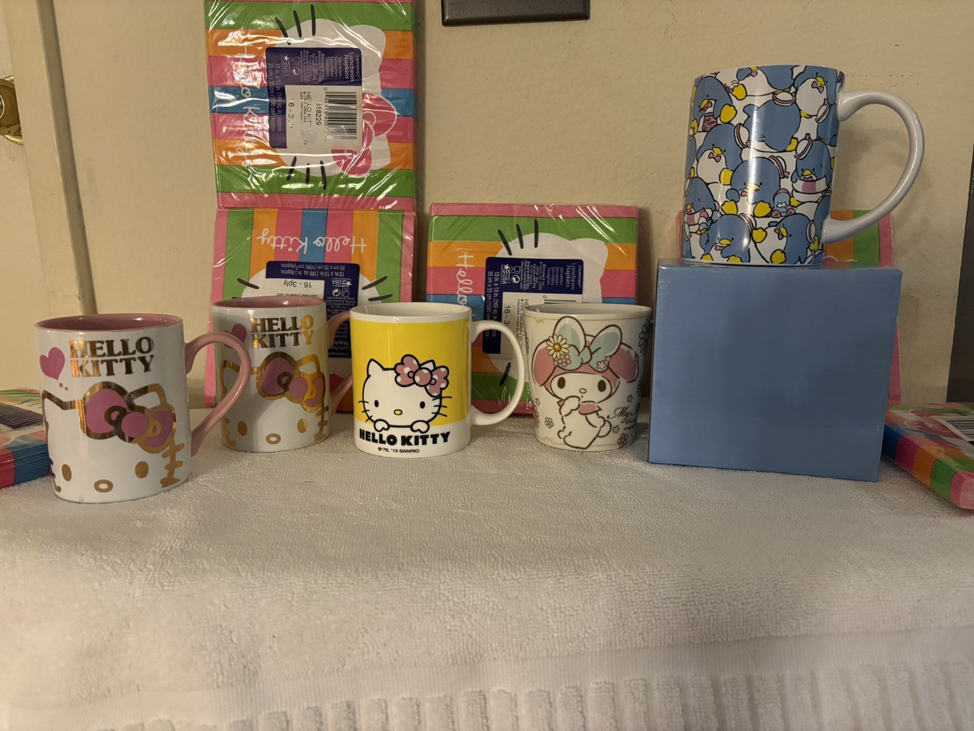 2 pink mugs $8 each 1 yellow mug $8 1 my melody mug $8 2 tuxedosam mugs $8 each