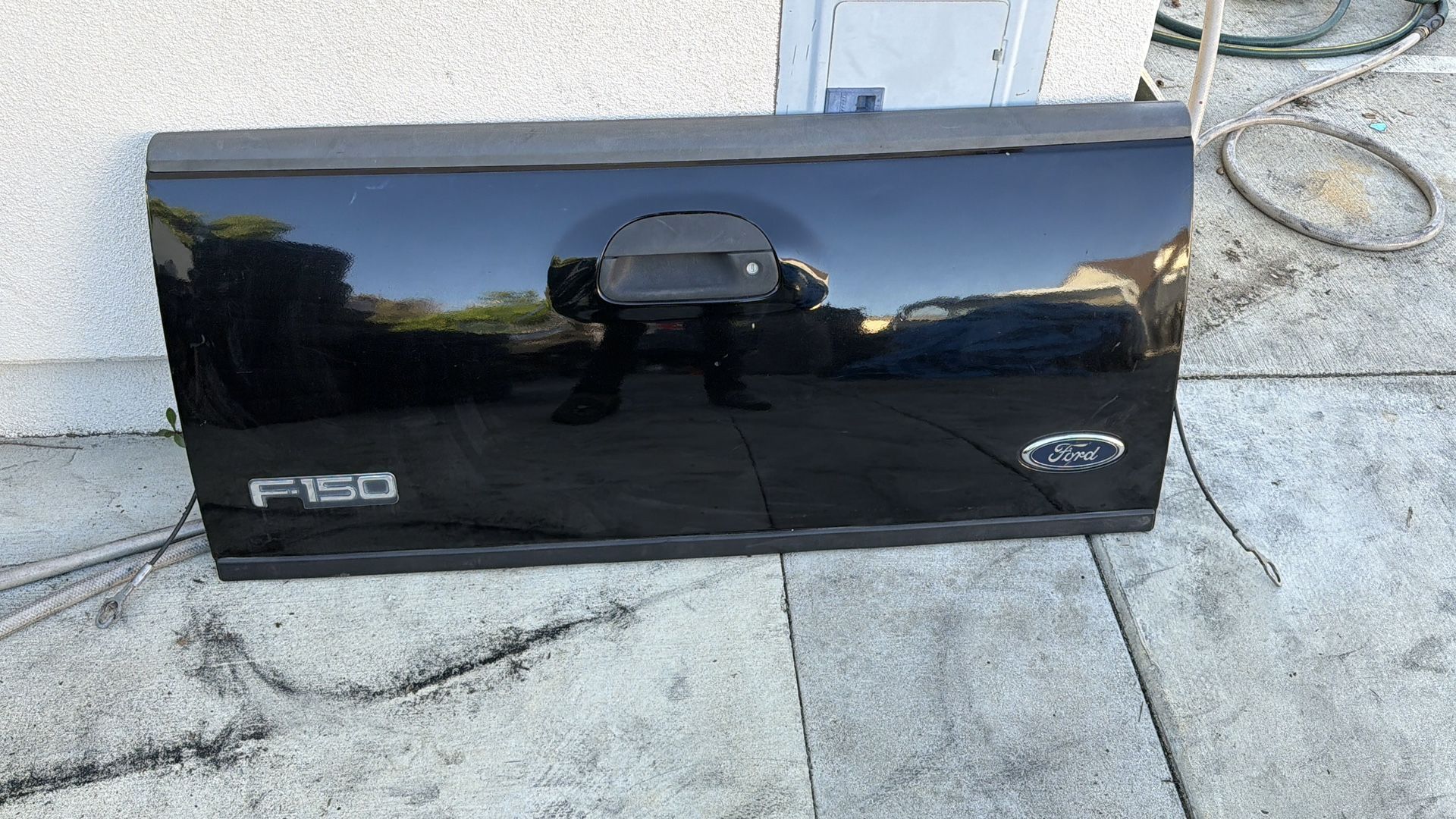 This is a black tailgate in working condition originally from a 2001 Ford F-150 step side pickup truck. It specifically fits on the stepside (flare side) model f150 truck with the narrow opening. It doesn’t fit on regular full size ford pickup trucks. It has a few small dings, but still looks good. It comes with the handle and all inner workings as well as the cables which hold it open. I don’t have the key.