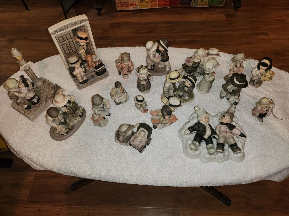 We have a group of 19 Enesco figurines from the Kim Anderson Collection available. All are in great condition, there are no chips or chiggers. I am going to name some of the larger ones, there's too many to list all. Second picture shows "We've Only Just Begun" (1997) and "Love Comes A Knocking When You Least Expect It" (2000) Third picture shows "A Little Bit Of Heaven" (1996); "You Light Up My Life" (1997); "Bringing You Christmas" (1996); "Love Makes The Medicine Go Down" (1996), the one in front is a miniature trinket box (1999) Fourth picture shows "A Rose For A Kiss How Can I Miss" (1995); "Be My One And Only" (1996); "Just You and Me Only" (1996) Fifth picture shows some single ones. Sixth picture shows "Tuesday's Child Is Full Of Grace, Beribboned And Bowed With A Whisper Of Lace" (1997), and others Last picture shows "Angels In Disguise" (2000) $120.00 for all 19 figurines. Pick-up ONLY in Franklin, IN.