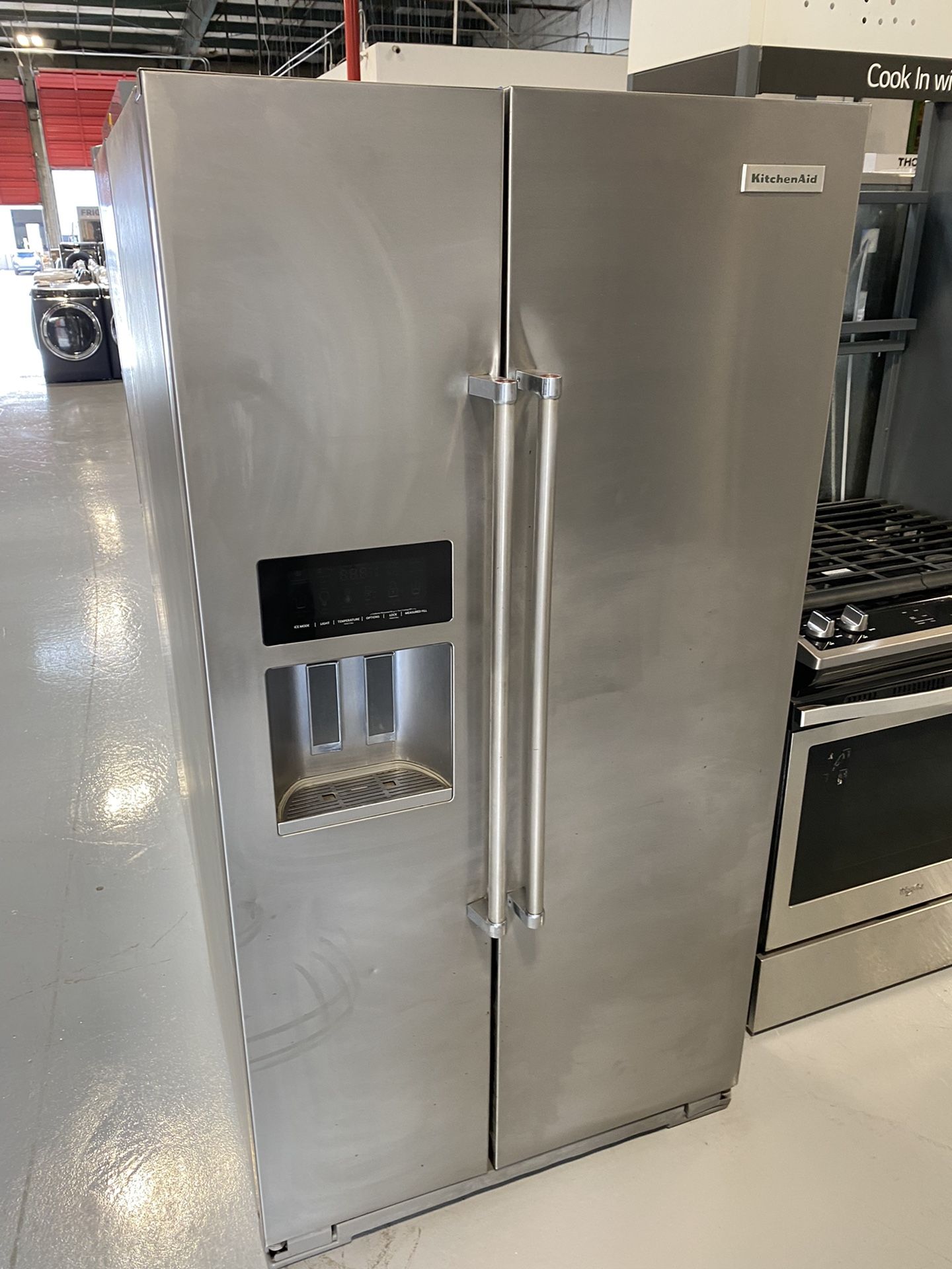 New Open Box KitchenAid Stainless Steel 24.8 Cu. Ft. Standard Depth Side-by-Side Refrigerator Model #KRSF505ESS Dimensions: Preserva Food Care System LED Lighting In-Door-Ice System Professionally inspired design Measured Water Fill Clear Door Bins with Metallic Accents Adjustable spill resistant shelves Includes a 12-month warranty Financing Available Delivery and installation available Contact us with any questions or to stop by to see this unit and others. Open Monday - Saturday 10am - 6pm Our inventory changes daily. Message us for availability.