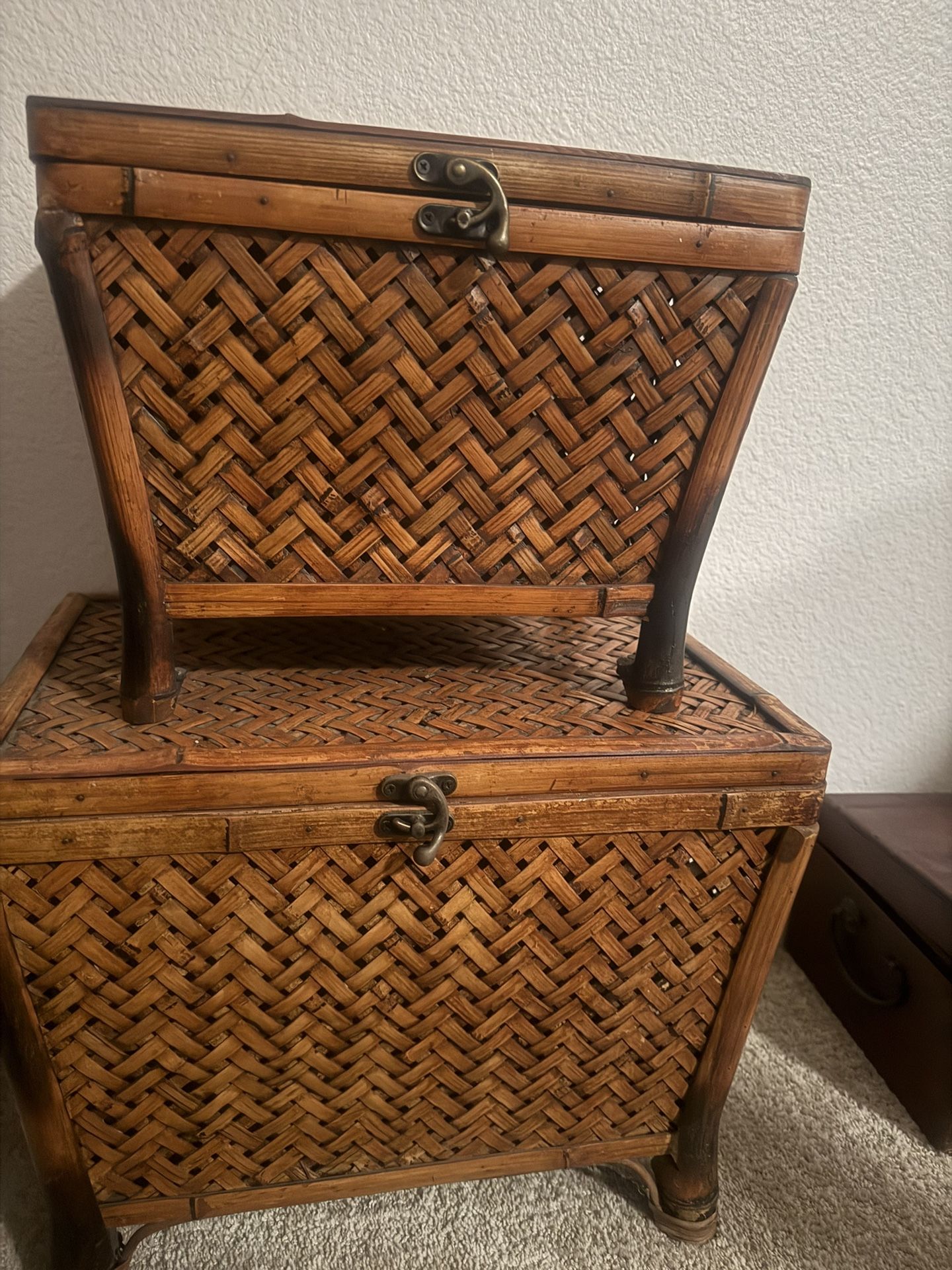 Two size wicker chest for storage of multiple things Large: 1ft 14in tall, 1ft 18in wide, 1 1/2 ft depth Small: 11 1/2in tall, 1ft 1/2in wide, 9 1/2 in depth