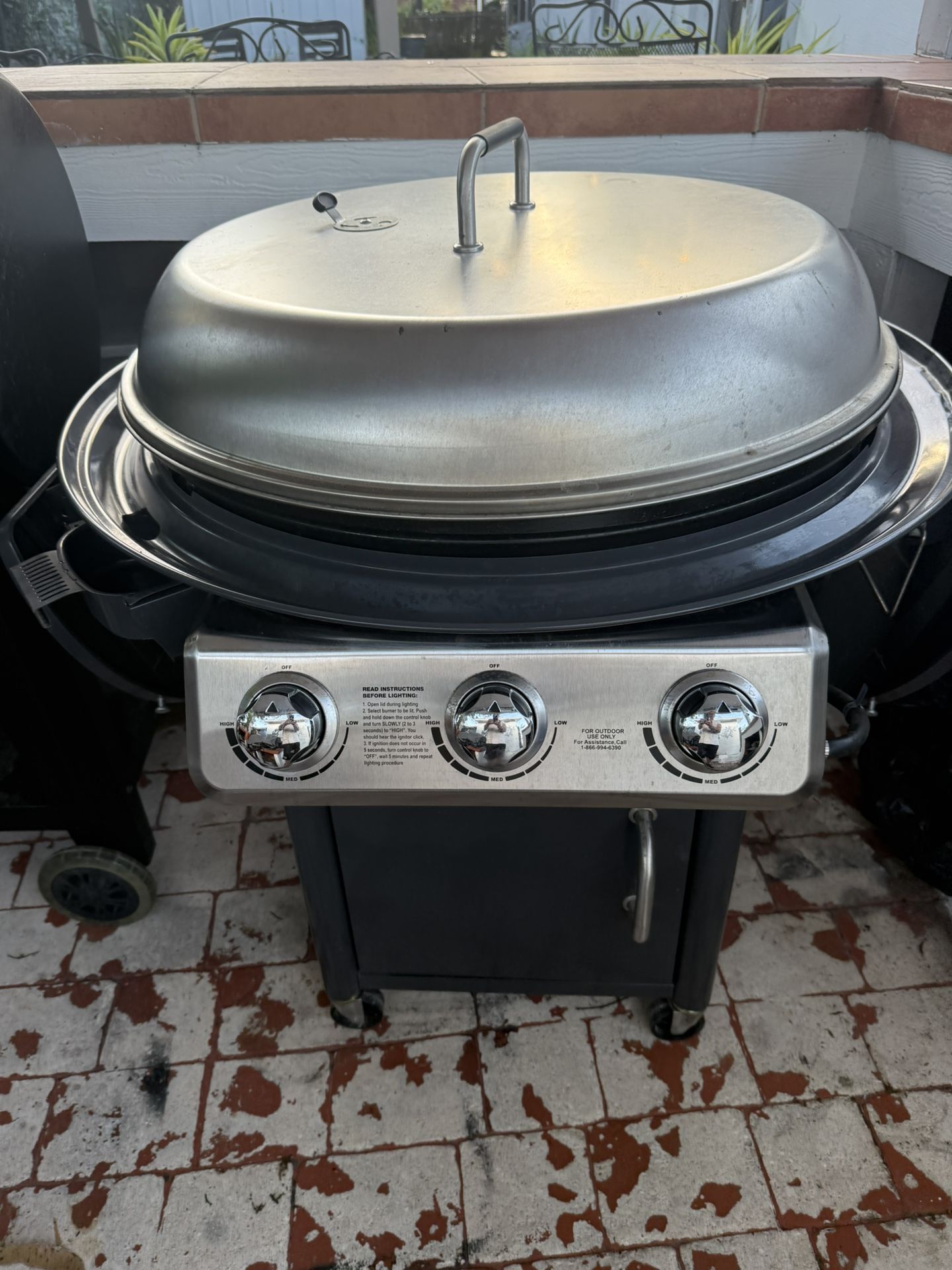 Cuisinart CGG-999 30-Inch Round Flat Top Surface 360° XL Griddle Outdoor Cooking Station & CGWM-057 XL 360° Griddle Cover,Grey Barely use cover included Propane tank not included ..
