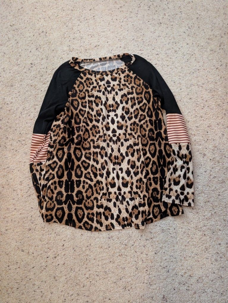 Stylish leopard print shirt with striped sleeves. Size L $15 OBO Pickup Shrewsbury, OOS