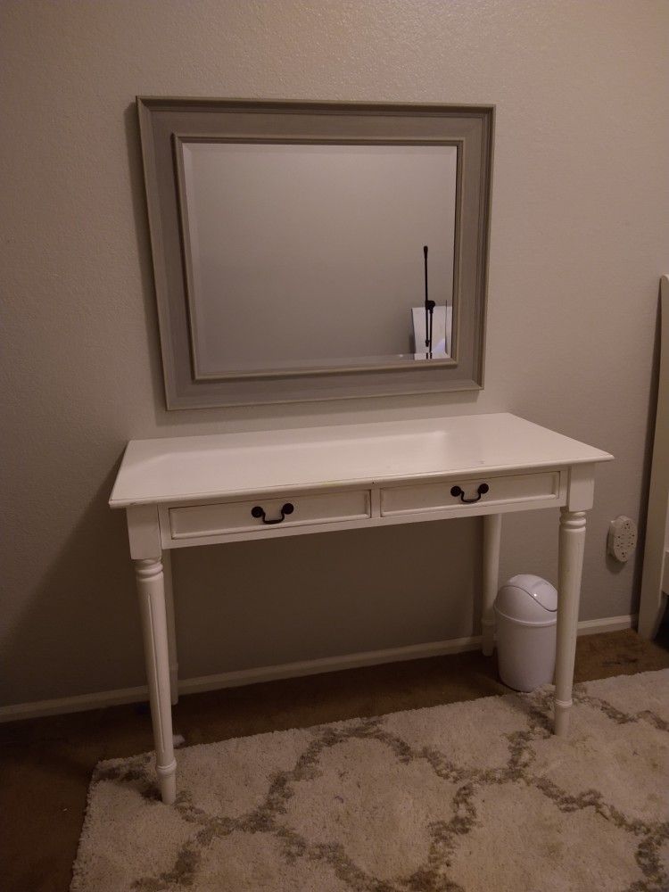 This quality piece was made by pottery barn. There is no particle board or fake wood anywhere on it, everything is solid wood. It's white in color and mirror is light grey. The table is 43x20x30 tall. The mirror is 35x29. The table is $150.00 and the mirror is $50.00. I'm willing to sell them together or separately