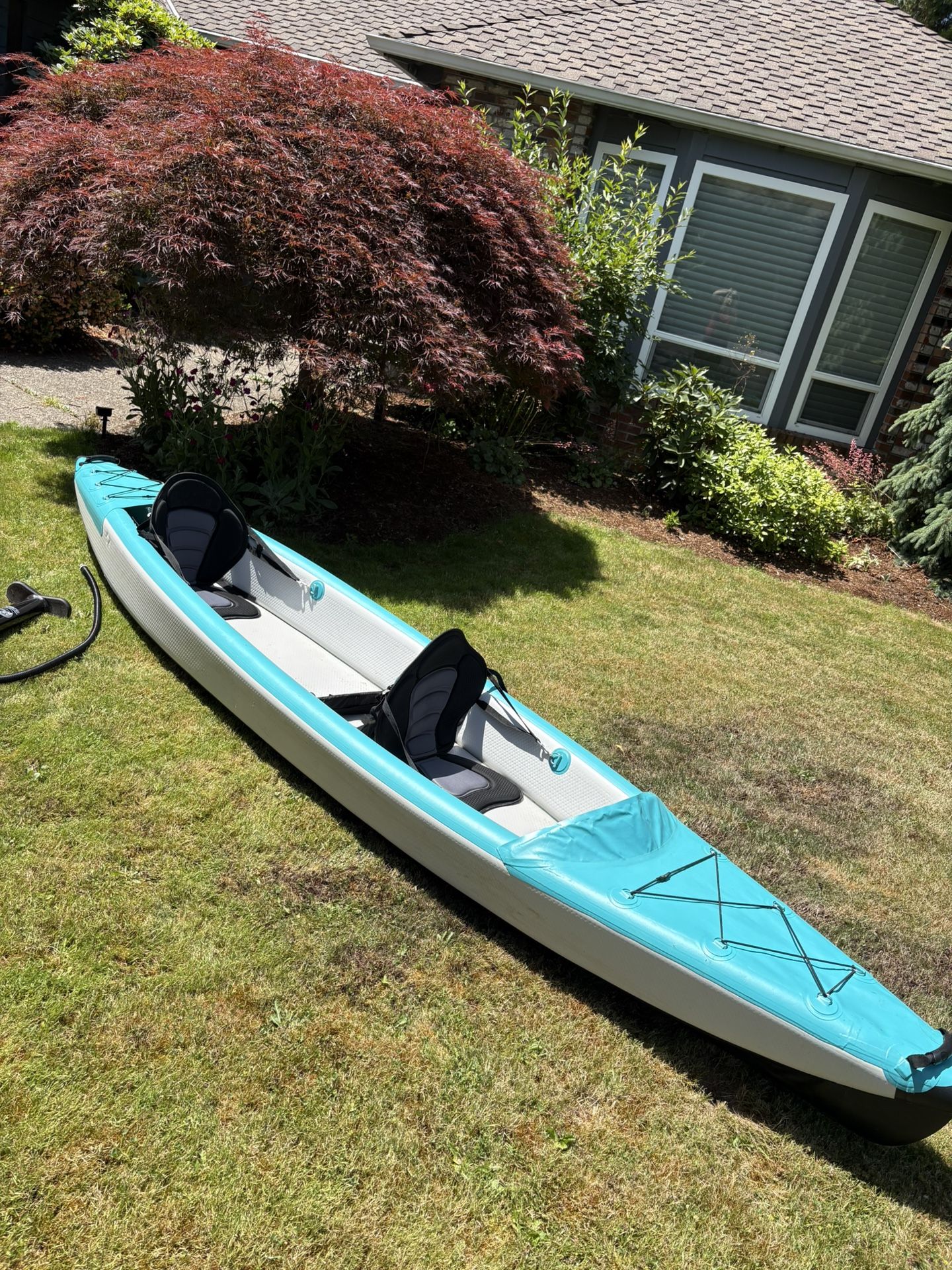 North Fork Outdoors / Dave Scadden Eclipse Drop Stitch Kayak for 2 people. Includes Backpack Carry Bag, Gear Duffle, Pump, Paddles, Seats, Repair Kit, Floatation Cushions, Removable Skeg, Foot rests Tapered, hard-nose bow and stern, combined with a fully constructed inflatable Drop Stitch technology hull with an attached inflatable drop stitch floor. Purchased in 2021, used about 10 times. In good condition, no tears or leaks. Holds air well! https://offerup.com/redirect/?o=aHR0cHM6Ly95b3V0dS5iZS9mcF8xRUJodGNEUT9mZWF0dXJlPXNoYXJlZA==
