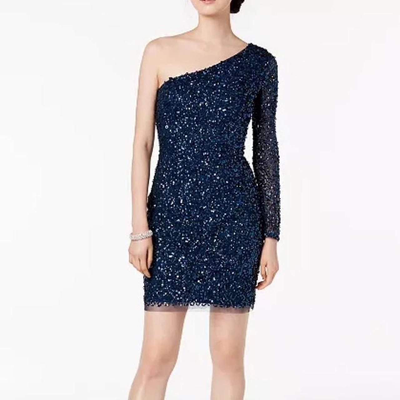 Adrianna Papell blue sequin one-shoulder mesh mini dress